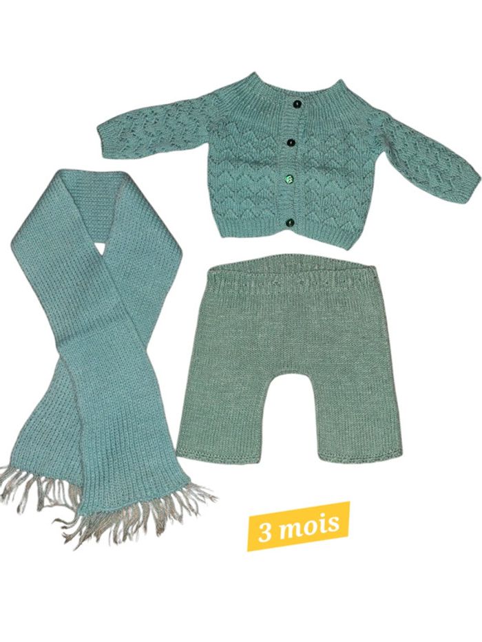 Echarpe + Gilet + Pantalon fait main Il faudrait mettre un lacet au niveau de la taille Remise activée par lot : 2 articles : 5% de réduction 3 articles : 10% de réduction 5 articles : 15% de réduction N'hésitez pas à regarder mes autres ventes #VP72_garcon_3mois #VP72_fille_3mois