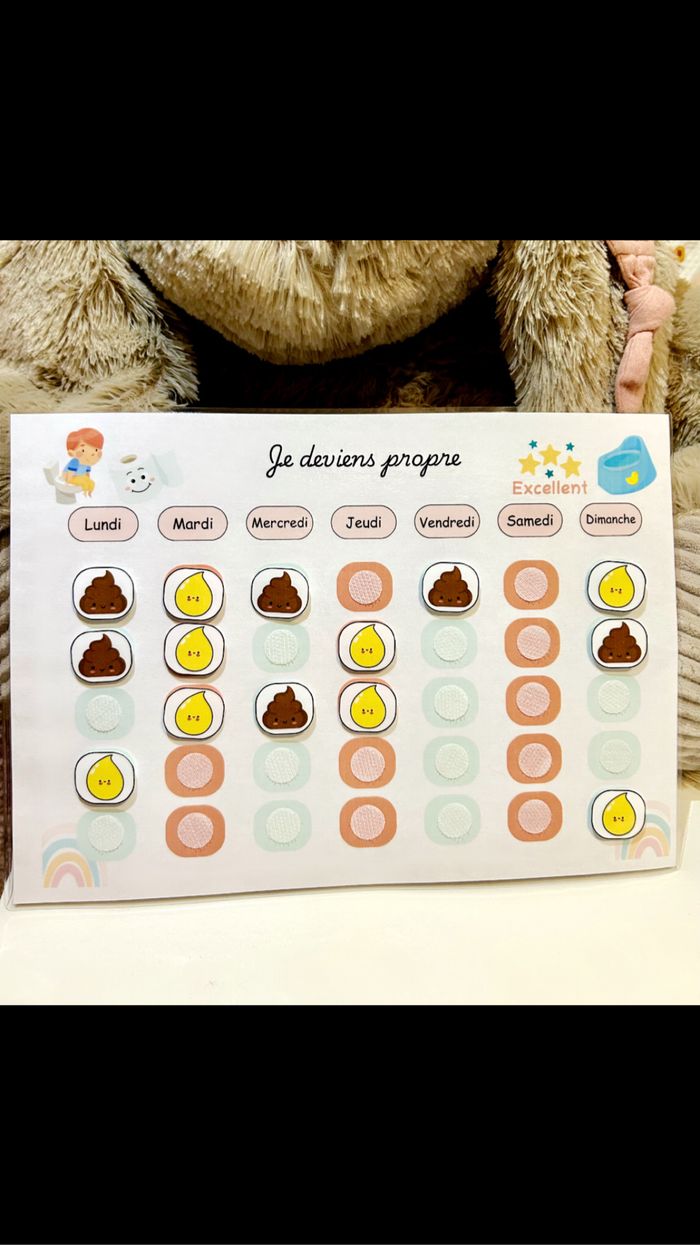 Fiche plastifiée avec éléments à scratch pour accompagner vos enfants dans l’apprentissage de la propreté.