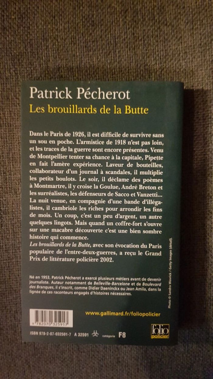 Résumé Dans le Paris de 1926, il est difficile de survivre sans un sou en poche. L'armistice de 1918 n'est pas loin, et les traces de la guerre sont encore présentes. Venu de Montpellier tenter sa chance à la capitale, Pipette en fait l'amère expérience. Laveur de bouteilles, collaborateur d'un journal à scandales, il multiplie les petits boulots. Le soir, il déclame des poèmes à Montmartre, il y croise la Goulue, André Breton et les surréalistes, les défenseurs de Sacco et Vanzetti... La nuit venue, en compagnie d'une bande d'illégalistes, il cambriole les riches pour arrondir les fins de mois. Un coup, c'est un peu d'argent, un autre quelques lingots. Mais quand un coffre-fort s'ouvre sur une macabre découverte c'est une bien sombre histoire qui commence. Les brouillards de la Butte, avec son évocation du Paris populaire de l'entre-deux-guerres, a reçu le Grand Prix de littérature policière 2002. Réductions activées dès 2 articles achetés Envoi rapide #tweess_livres