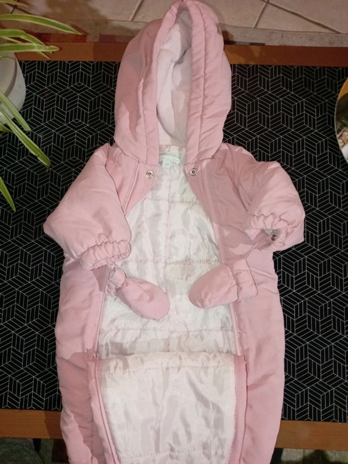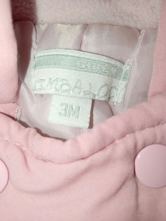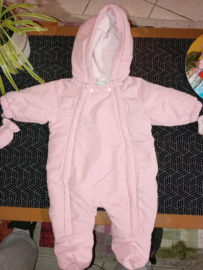 Jolie combinaison d'extérieur hiver . En matière douce . Capuche intérieur polaire douce , gants , fermeture entière devant+ boutons pressions . Rose . 3 mois . Très bon état , pas trou , pas de tâche . Pensez au lot 🌸