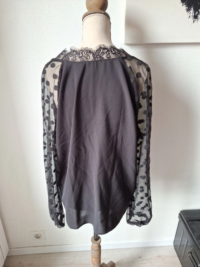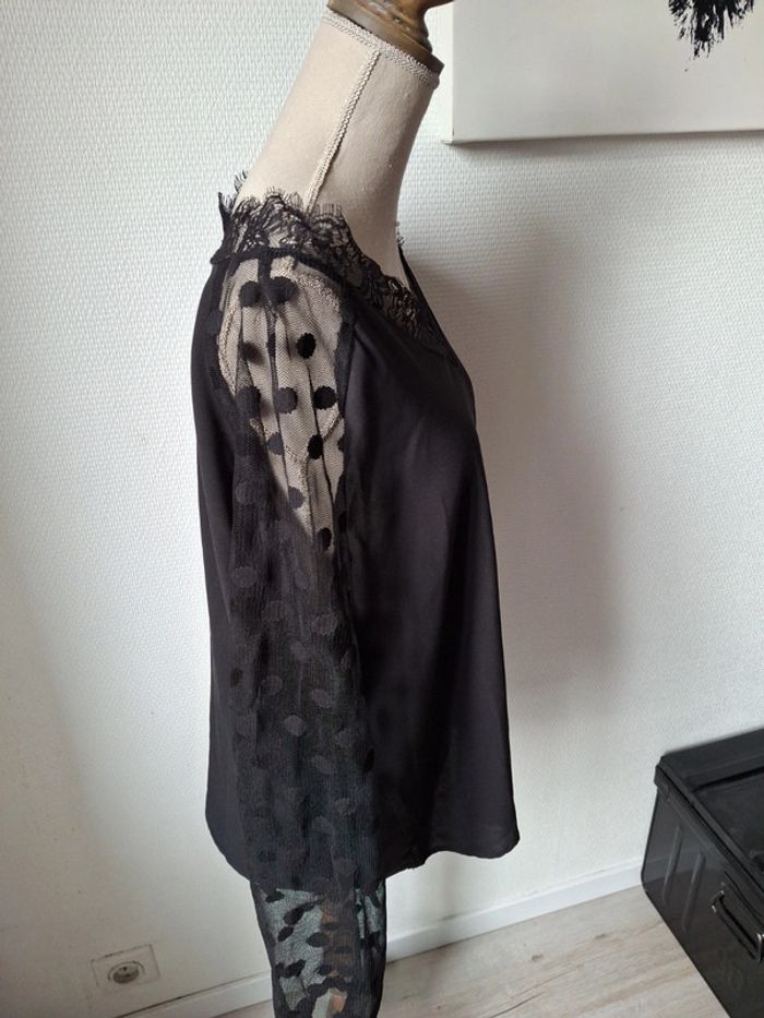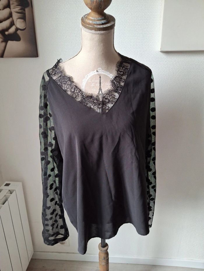 Acheté à une vintie mais pas porté (trop juste niveau poitrine) Plus d'étiquette de taille ni de matière Double matière viscose et dentelles Aisselles à aisselles 56 cm