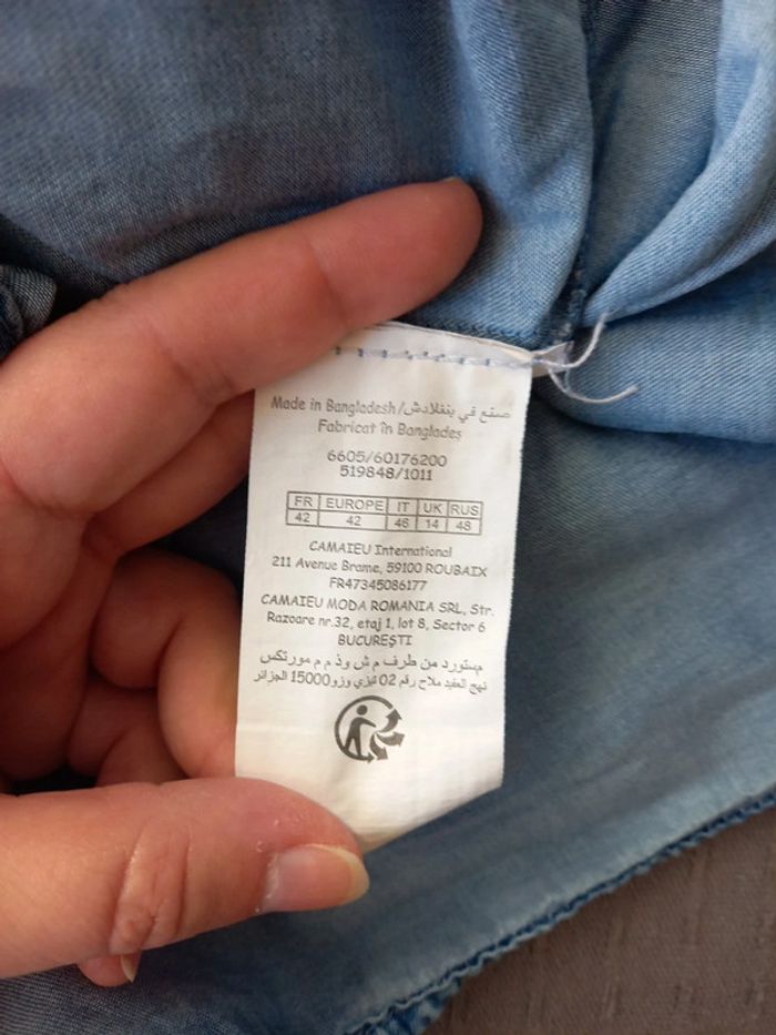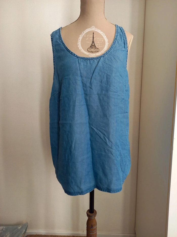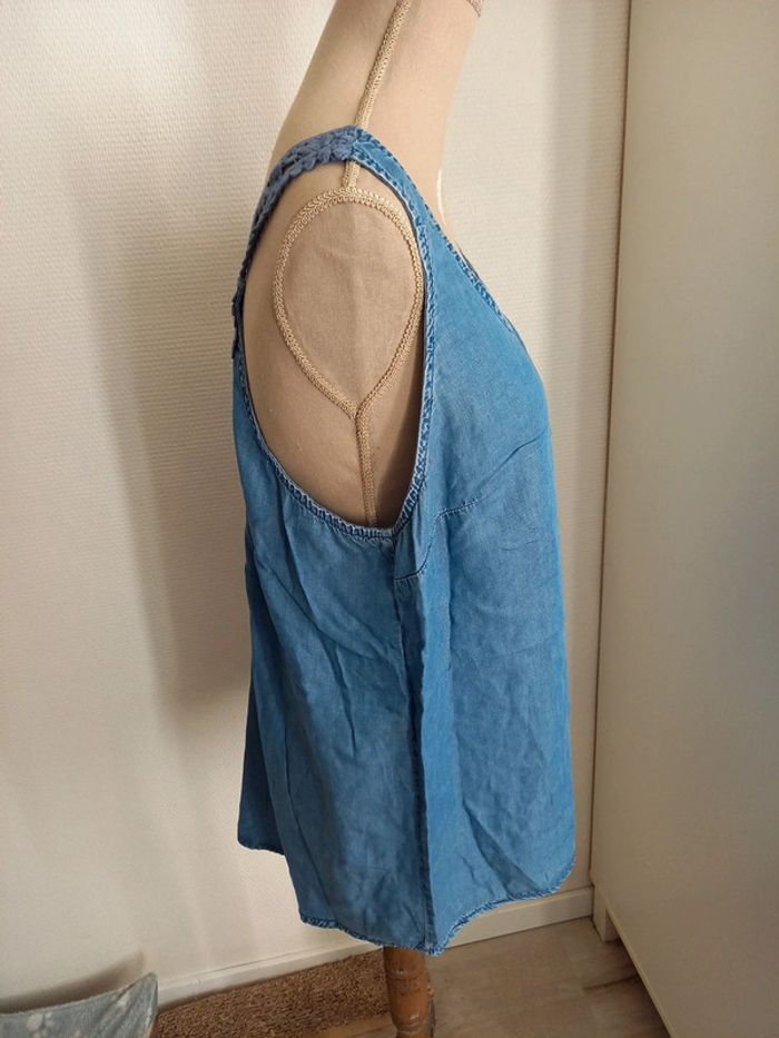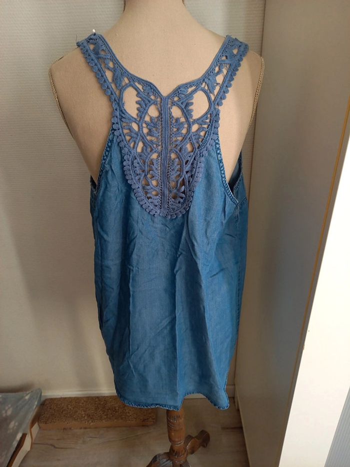 Couleur jean T42 Largeur sous aisselles 50 cm Longueur sous aisselles 42 cm Motifs dans le dos Matière lyocell