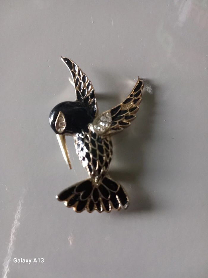 Émail noir , strass clair, broche colibri en métal tonalité d’or #bamboumimosabijoux