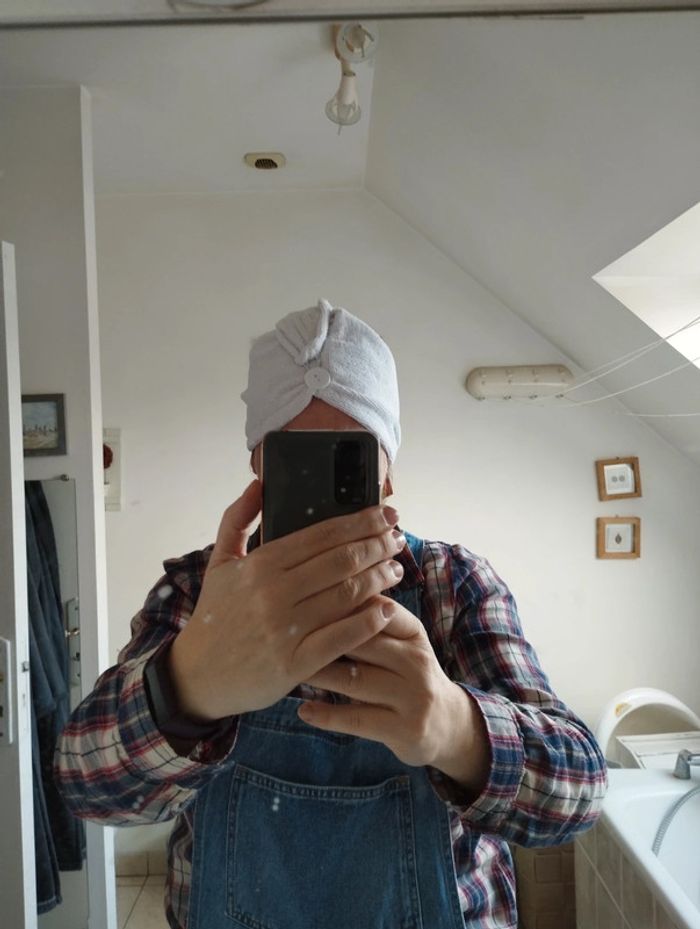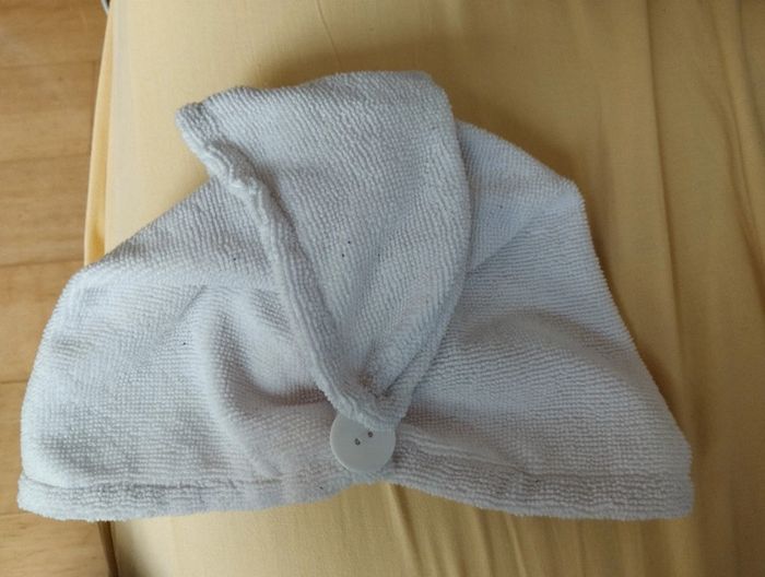 Porte pour la photo puis lave. Se noue autour des cheveux en turban et se ferme avec un élastique à mettre autour d'un bouton