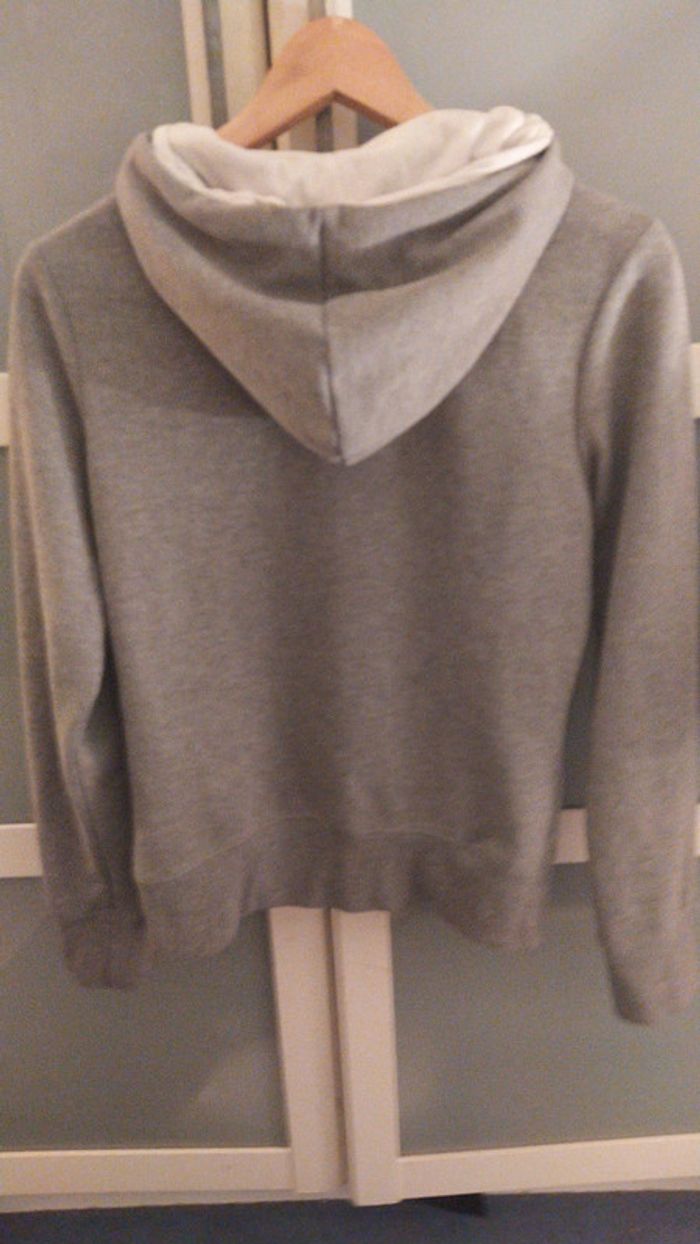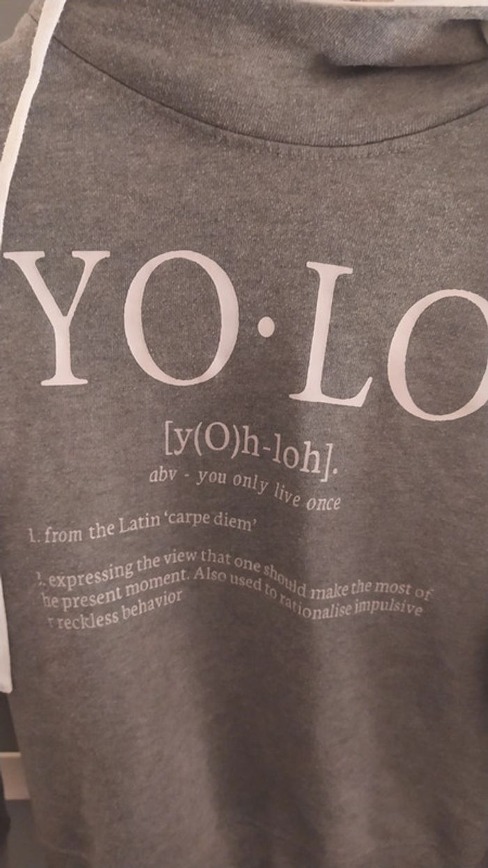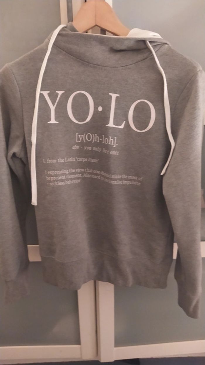 Gris pâle avec inscription blanches yolo comme you only live once. Indiqué taille 38 mais taille plus petit selon moi capuche doublée en blanc Pas de photo portée car trop petit pour moi