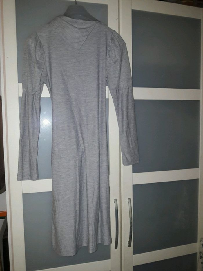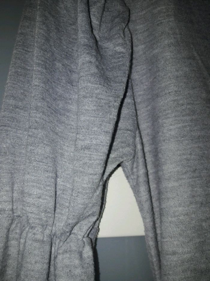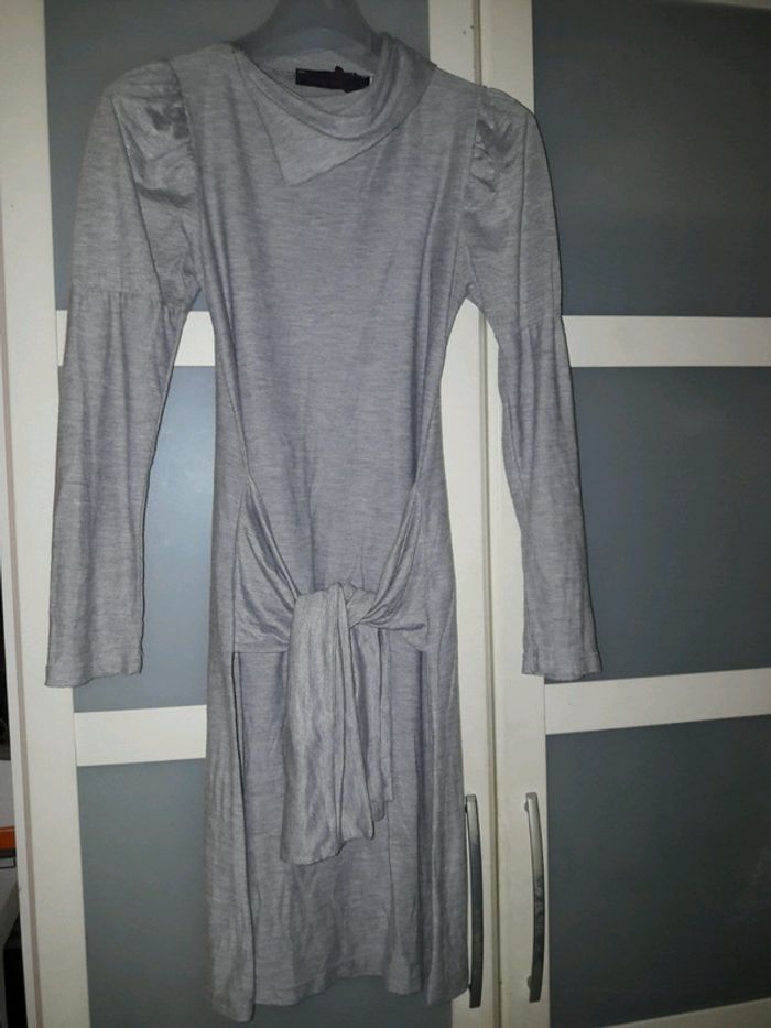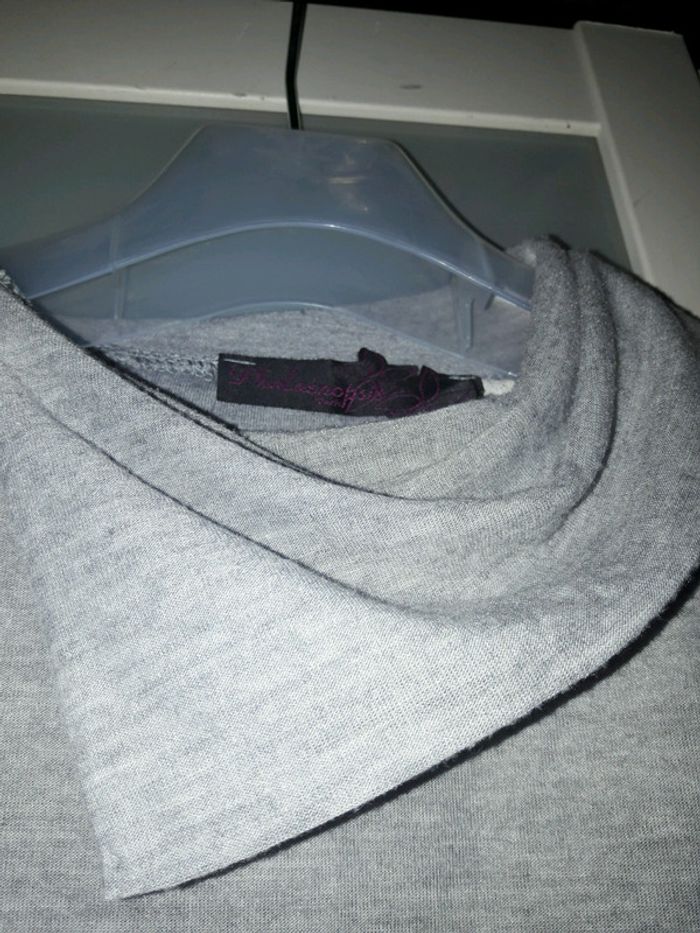 Pas de photo portée car trop petite pour moi Joli col châle asymétrique avec ceinture à nouer sur le devant Matière extensible avec du stretch et du coton Deux gris différents, aux manches ballons légèrement pailleté