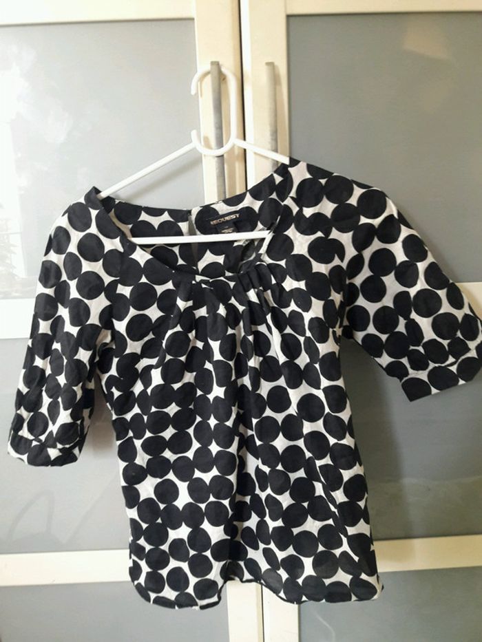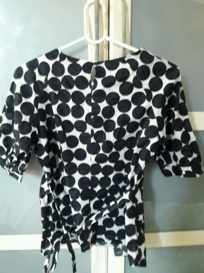 Manches courtes, lien à nouer dans le dos. Gros pois noirs sur fond blanc