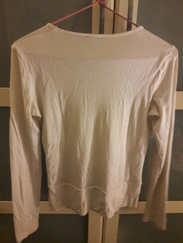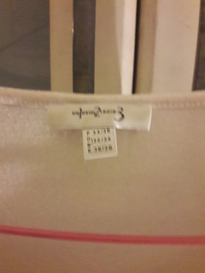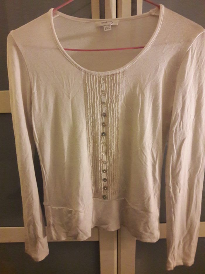 Plissé sur le devant avec des boutons en nacre très doux à porter Pas de photo portée car trop petit pour moi : indiqué 34/36 Coloris blanc cassé