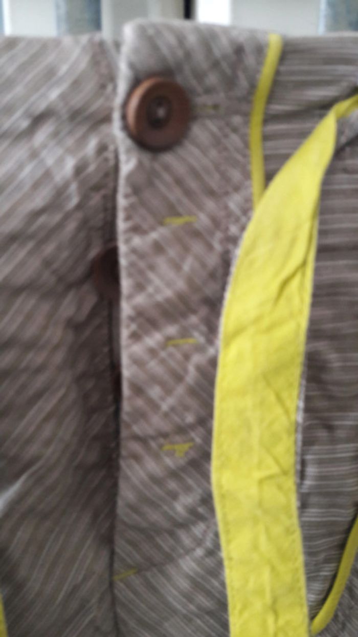 A motifs beige/kaki et détails jaune fluo, boutons et ceinture Poches sur les côtés Pas de photo portée car trop petite pour moi