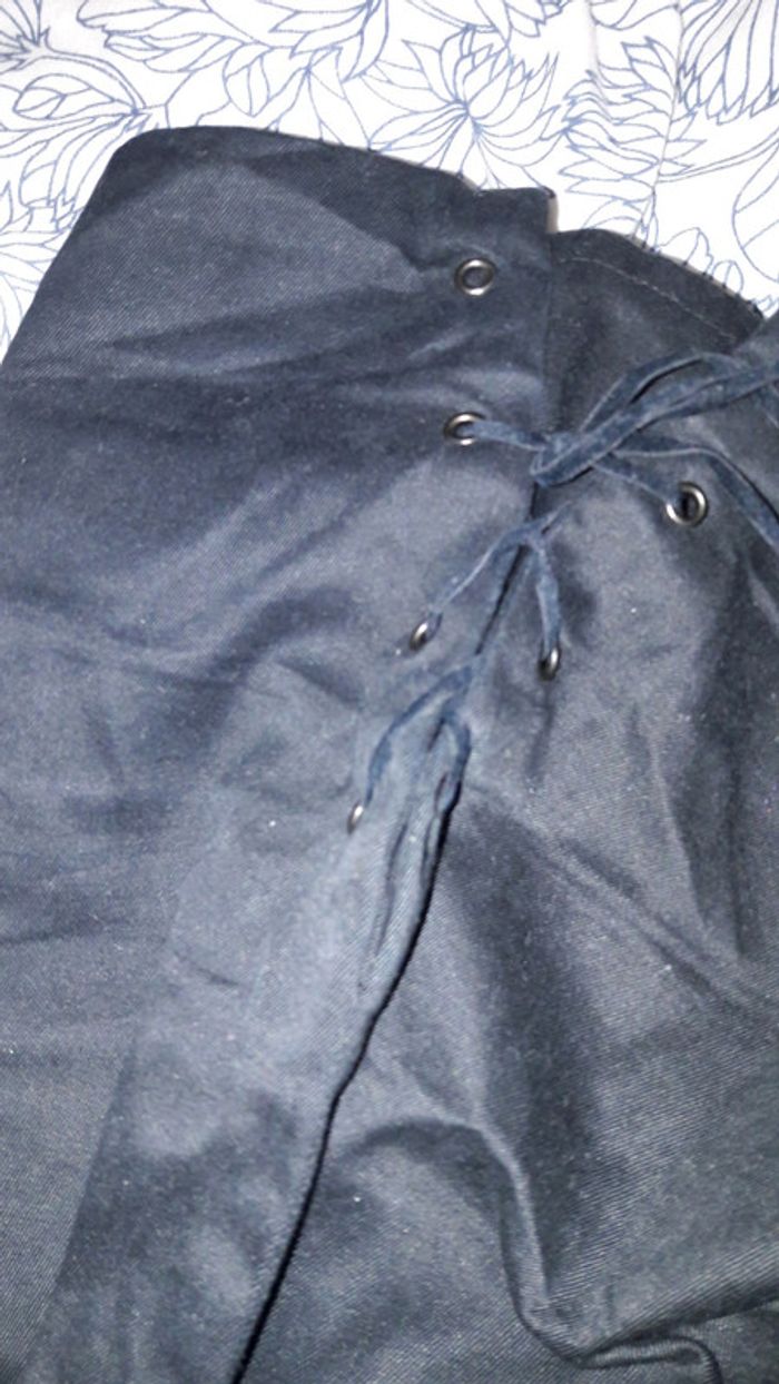 Il est bien noir comme rue la photo avec l'étiquette Se ferme avec liens à nouer au niveau de chaque hanche Manque un lien mais un lacet suffit d'où la mention état satisfaisant