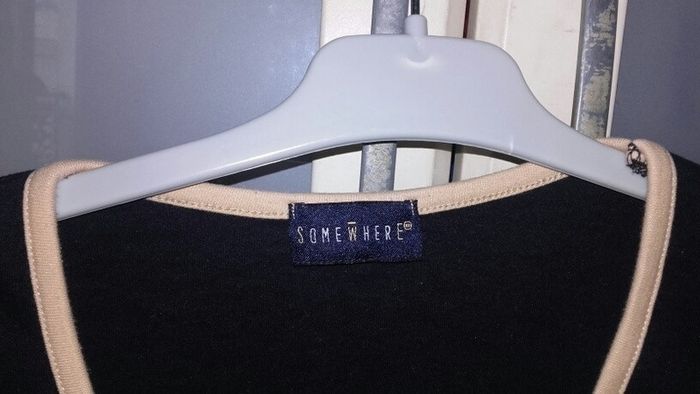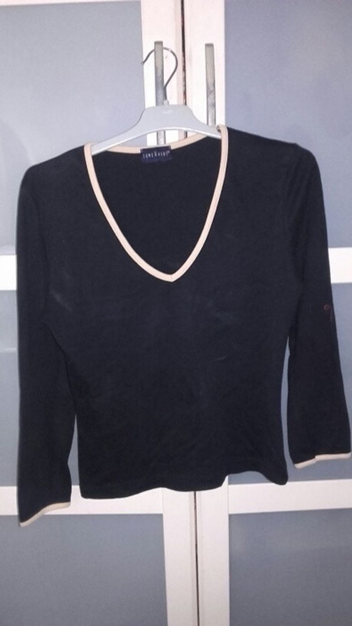 Tee shirt noir, col et poignets beiges - photo numéro 1