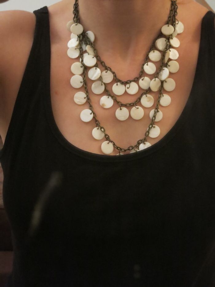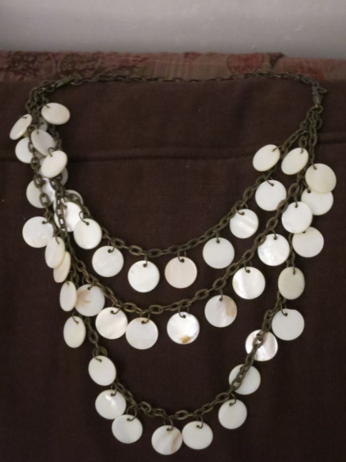 Pastilles imitation nacre sur un collier de maille cuivrée Plastique et métal cuivré Pas d'échanges, je cherche à financer un voyage ;-)
