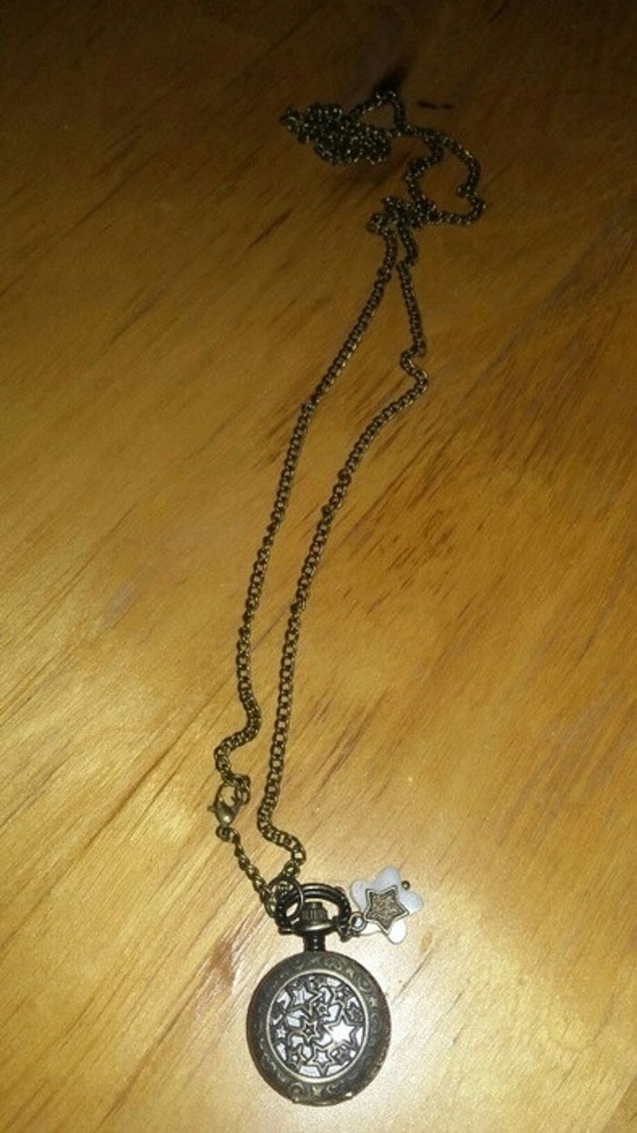 Joli collier avec pendentif montre gousset qui s'ouvre et deux étoiles #vintage #montre gousset
