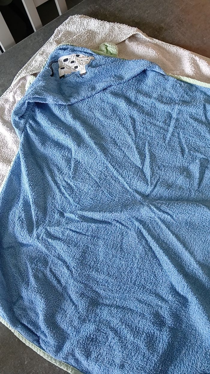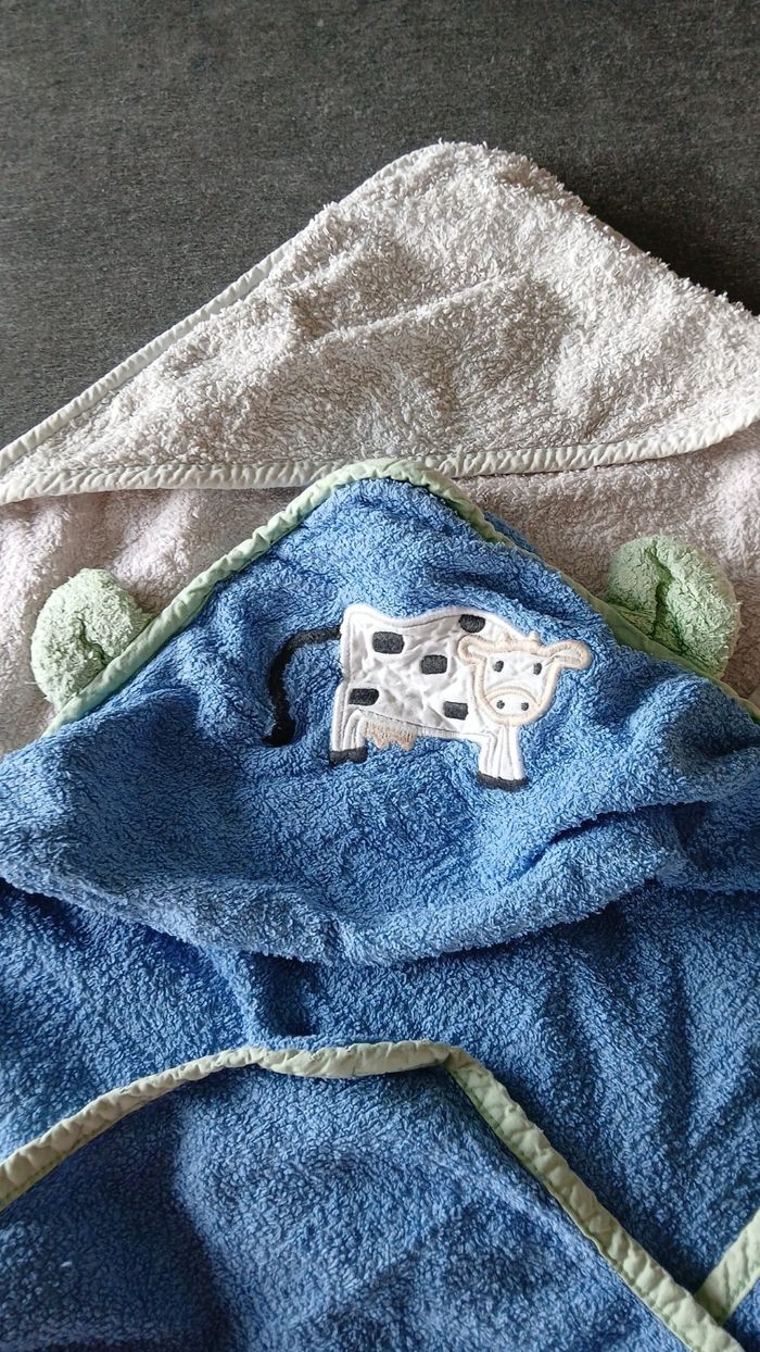Lot de deux capes de bain, bon état, une bleu avec liseré vert motif vache sur la capuche et une blanche rosée.