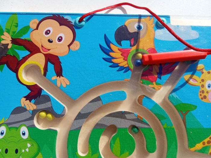 Plateau en bois recouvert d'un plexiglas permettant à l'enfant de déplacer à l'aide du stylo les billes. Trace d'utilisation sur le plexi. Bon état général, marque Playtive Beaucoup d'autres jeux, jouets en bois également à vendre ds mon dressing et réduction activée