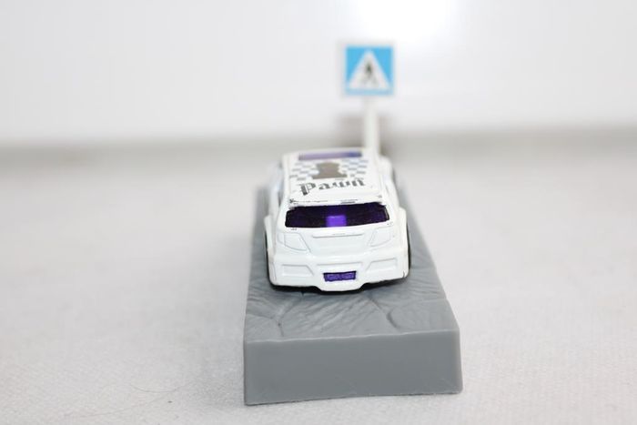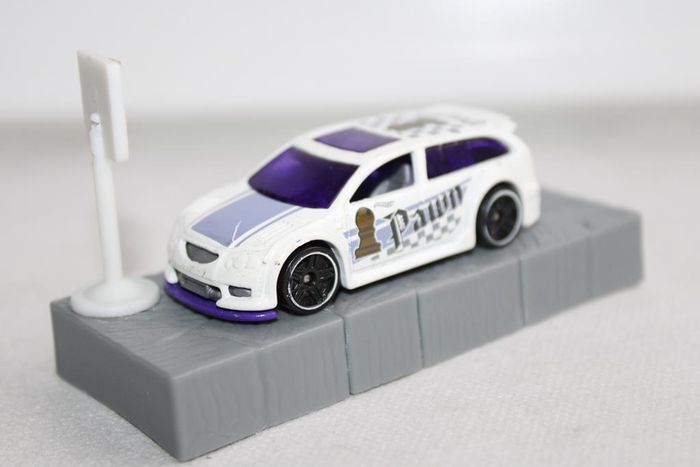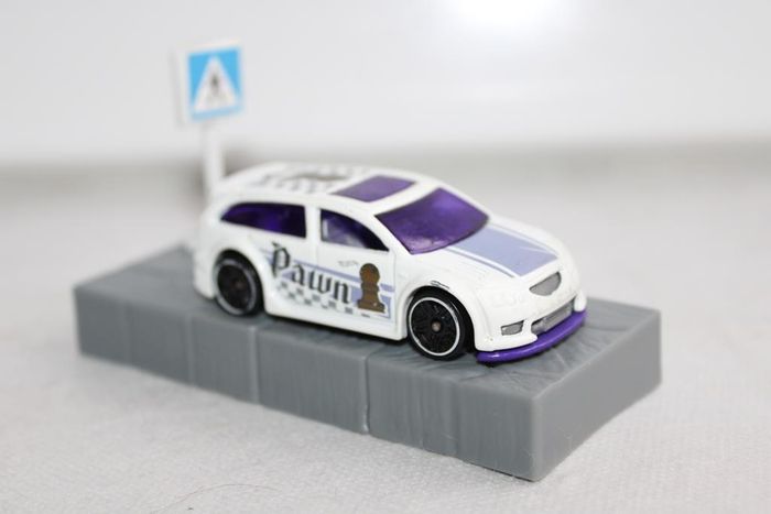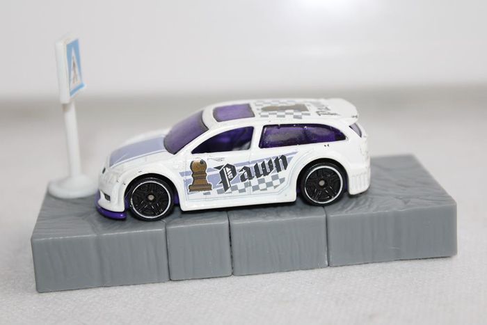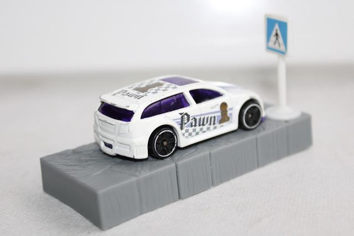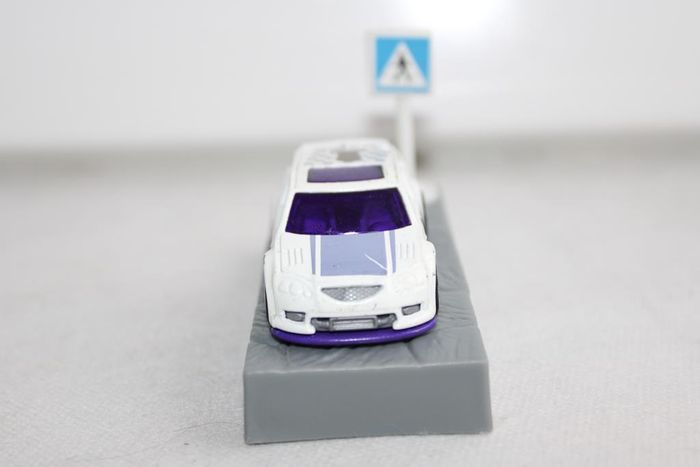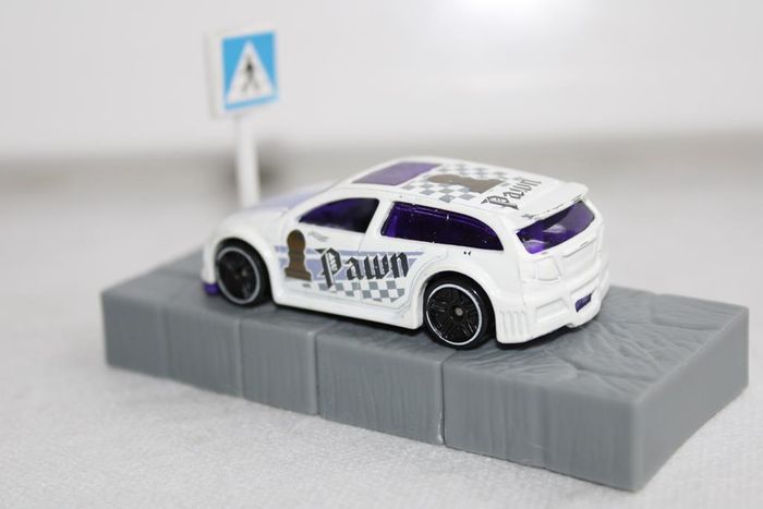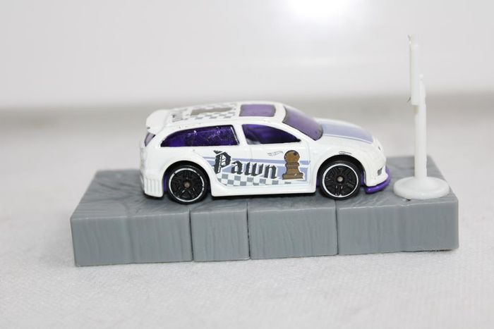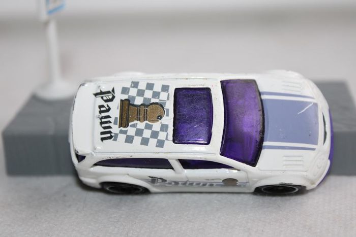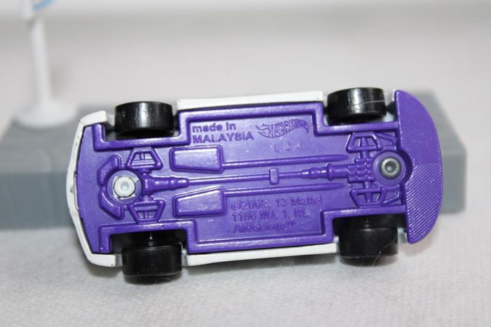 Voiture miniature fantaisiste Audacious. Echelle : Environ 1:64 Couleur : blanc et tampographie échec, vitrage violet Fabricant : Hot weels Année de production : 2002 Chassis : plastique violet Voiture miniature en bon état. Rares manques de peinture sur la carrosserie, les axes de roues ne sont pas tordus. Vitrage intact Réponse rapide Envoi soigné dans les meileurs délais
