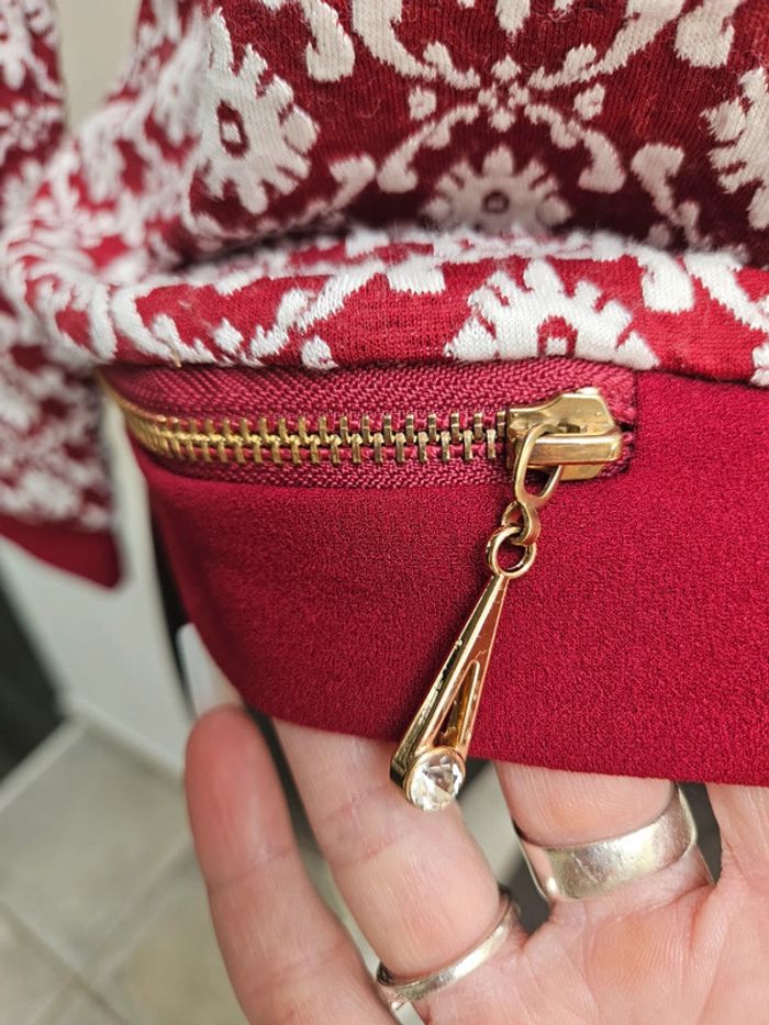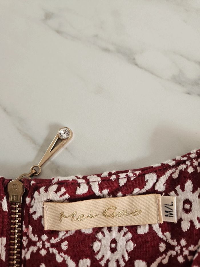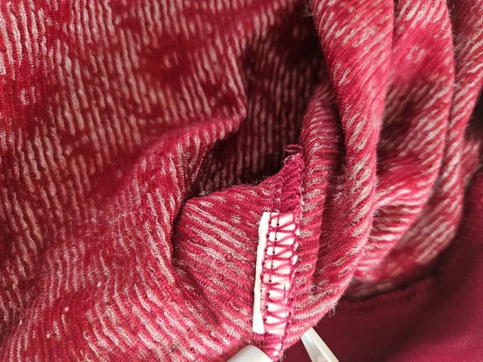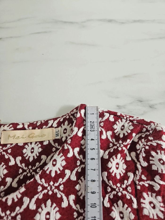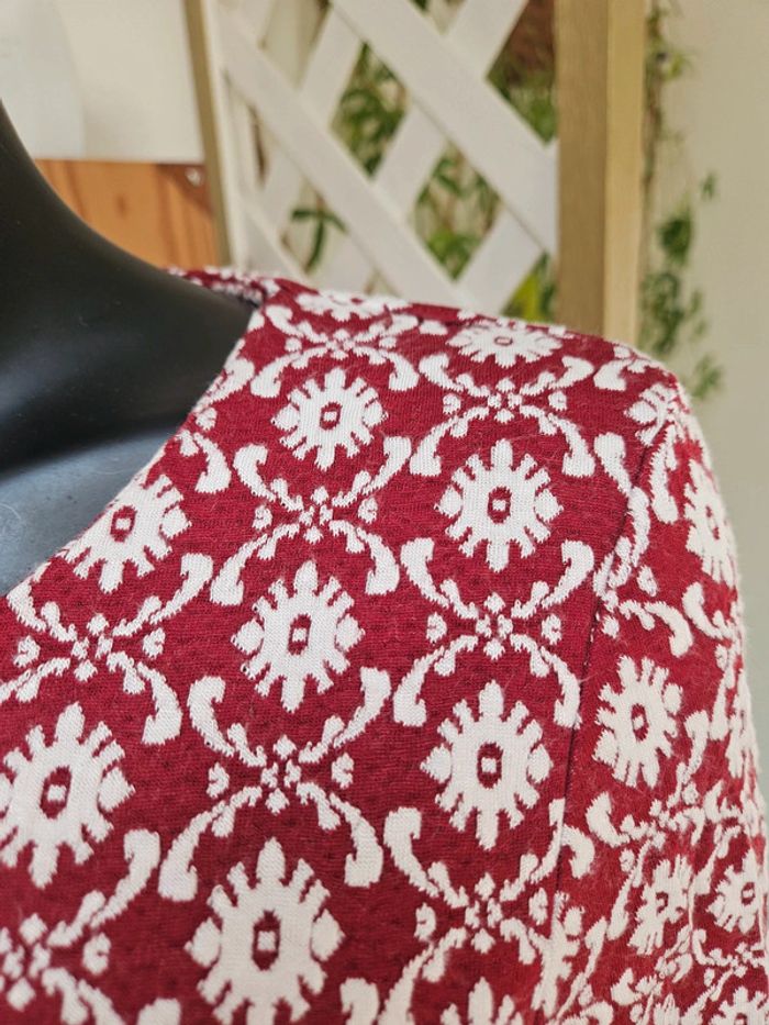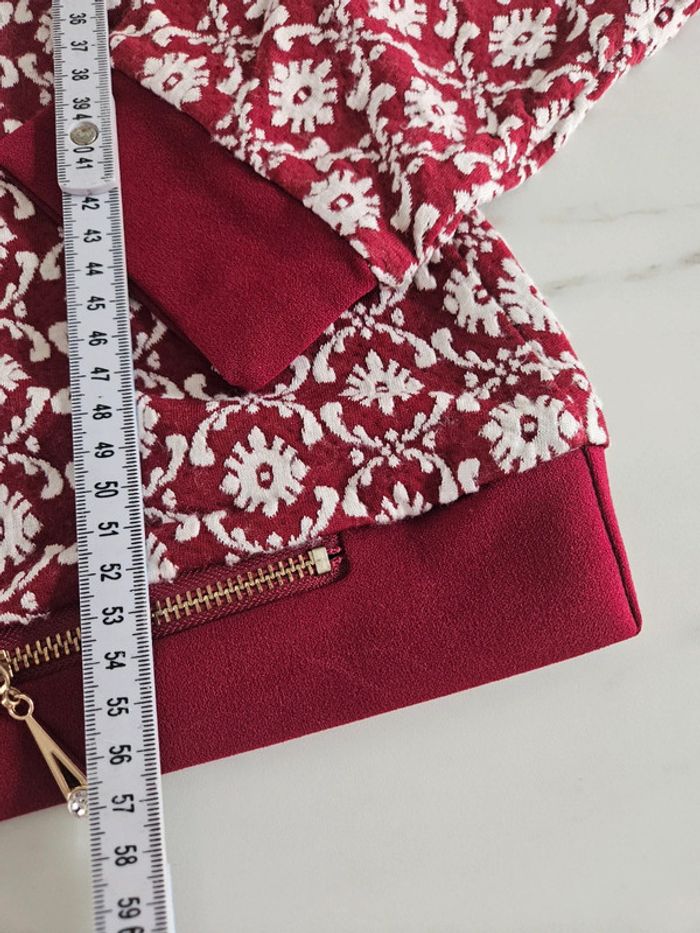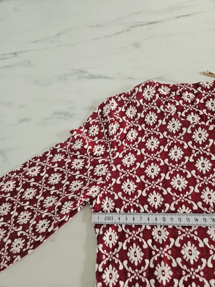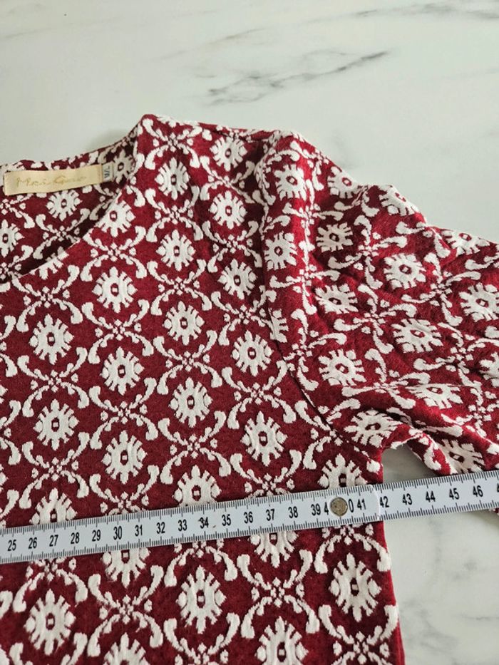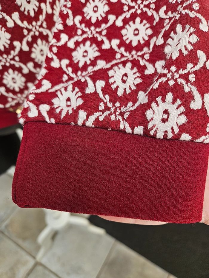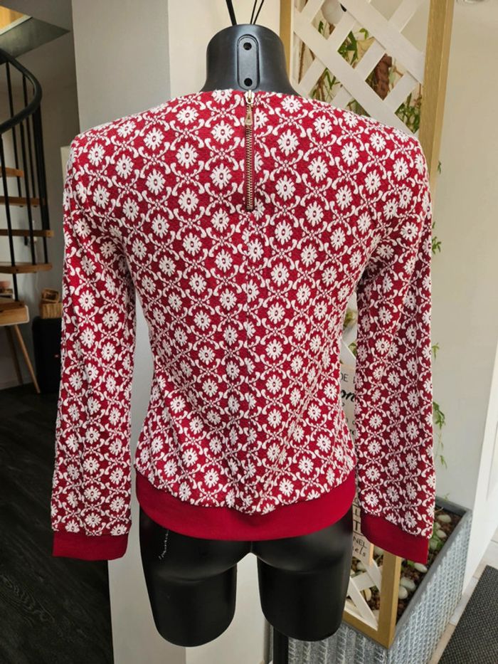 Rouge un peu bordeaux à fleurs blanches. Porté mais reste en très bon état. Matière agréable à porter. Je dirais plus que c'est un pull légé Dimensions sur les photos