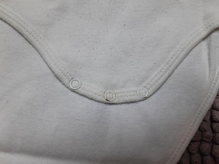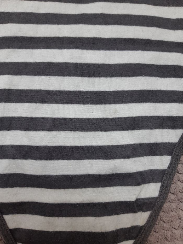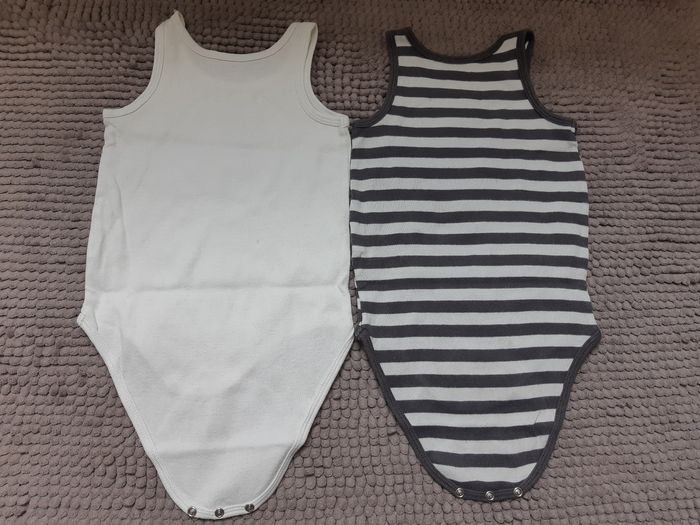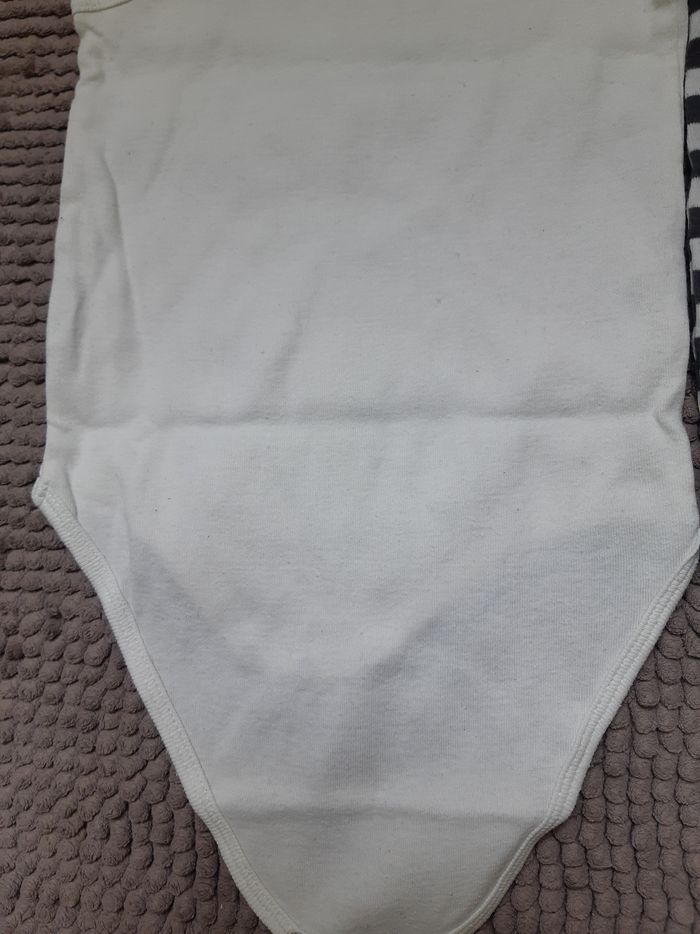 En bon état. Le bodie blanc bouloche un peu voir photo N°1, petite tâche au niveau de la pression. Le bodie rayé à une petite tâche dans le dos (photo N°7).