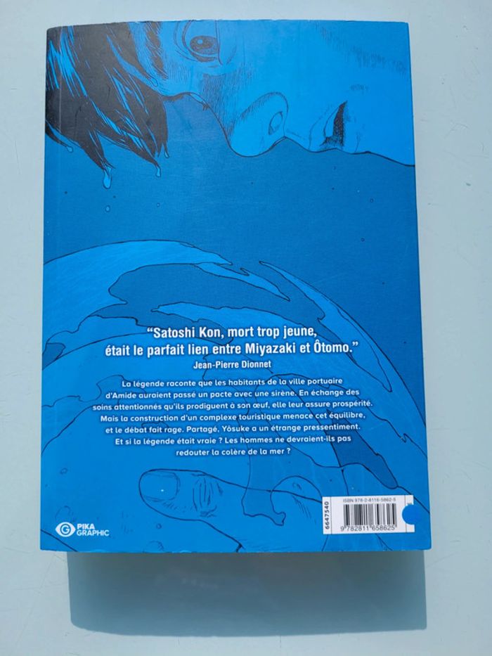 PIKA ÉDITIONS LE PACTE DE LA MER SATOSHI KON La légende raconte que les habitants de la ville portuaire d’Amide auraient passé un pacte avec une sirène. En échange des soins attentionnés qu’ils prodiguent à son oeuf, elle leur assure prospérité. Mais la construction d’un complexe touristique menace cet équilibre, et le débat fait rage. Partagé, Yôsuke a un étrange pressentiment. Et si la légende était vraie ? Les hommes ne devraient-ils pas redouter la colère de la mer ? En très bon état Mes autres mangas : #mangamooglou