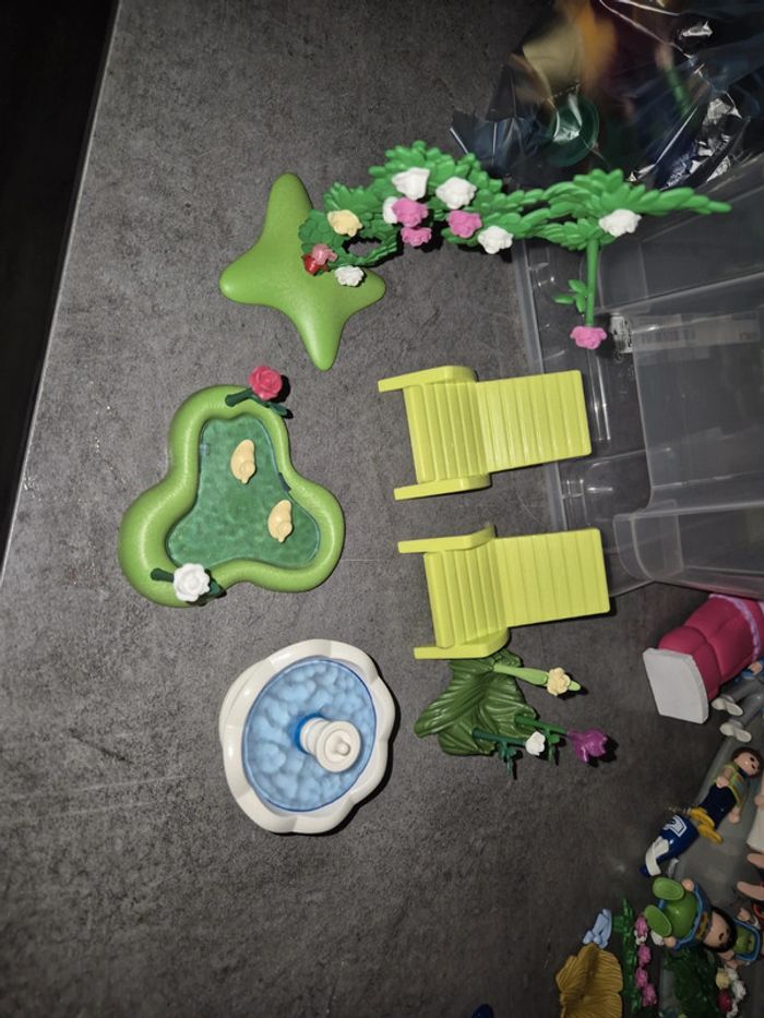 Lots accessoires playmobil fontaine, 2 transat, une marre avec 2 canards, et 2 accessoires fleurie