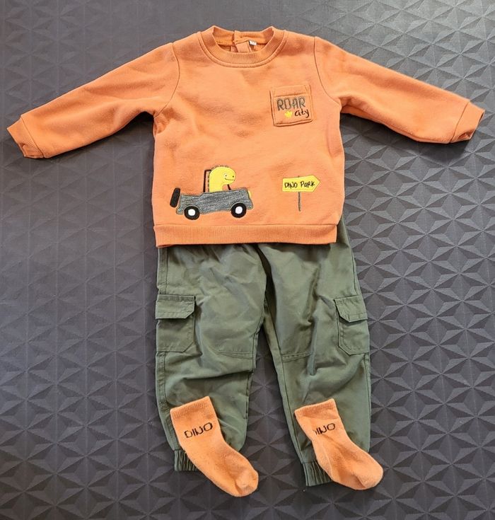 Pull orange motif dino Pantalon léger vert kaki Chaussettes oranges