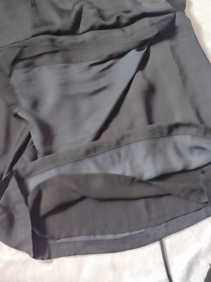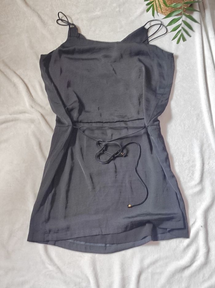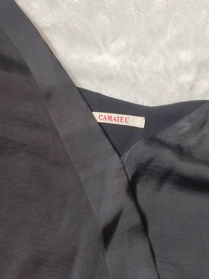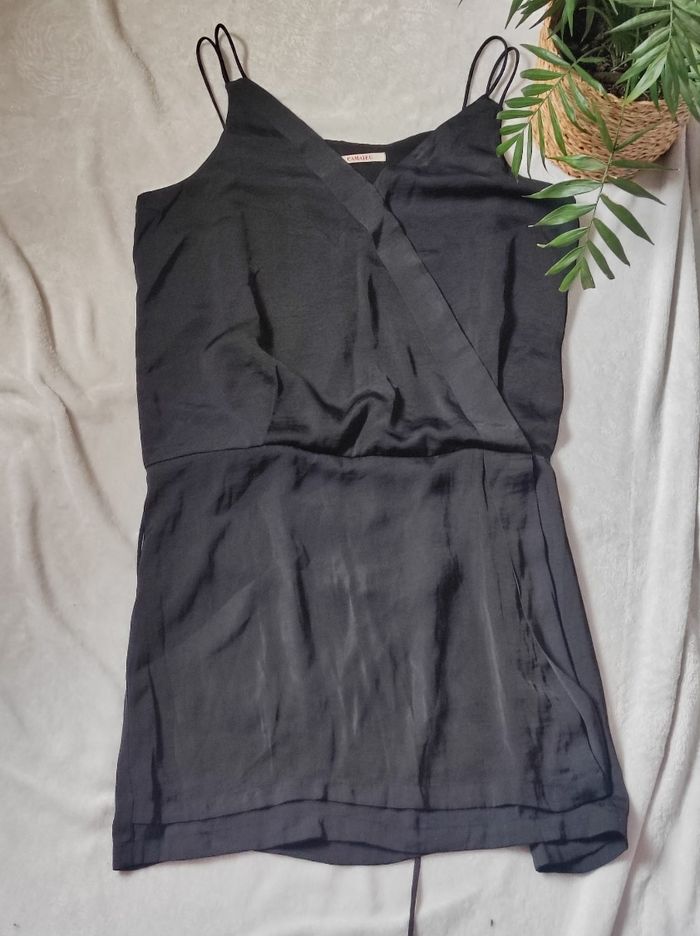 jolie petite robe noire a fine bretelles et décolleté en petit v. Matière légère et fluide ( douce comme de la soie au toucher), robe finement doublée. Cordon à serré a l'arrière pour affiner la silhouette. Marque camaïeu en taille unique. Peu porté en très bon état Dimensions aisselles 51cm.
