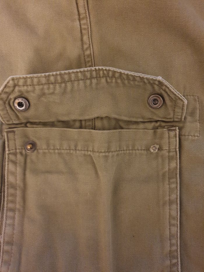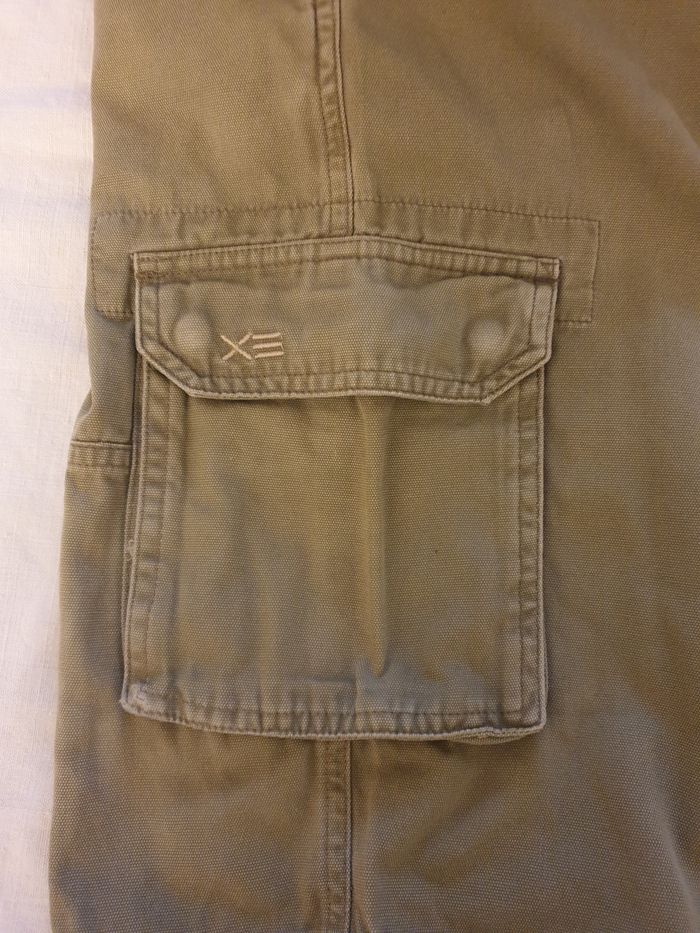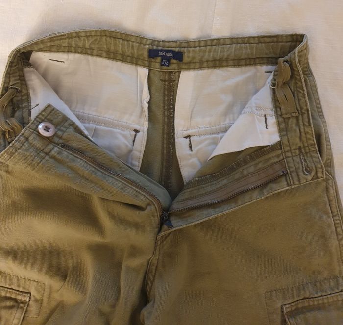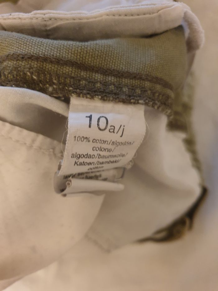 Short bermuda kaki pour petit garçon de 10 ans, en bon état général. 2 poches ouvertes à l’avant 2 poches genoux avec rabat qui ferme avec 2 pressions. Celle de la jambe gauche, a une pression défectueuse, ce qui n’empêche pas de porter le vêtement. 2 poches arrière avec rabat avec attaches pressions. Tex Basic 10 ans 100 % coton Les mesures, prises à plat, sont données à titre indicatif et peuvent varier de quelques millimètres. - Largeur taille : 32 cm - Longueur : 56 cm - Longueur entrejambe : 29 cm Envoi rapide et soigné.