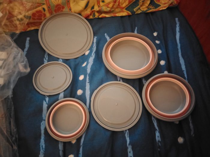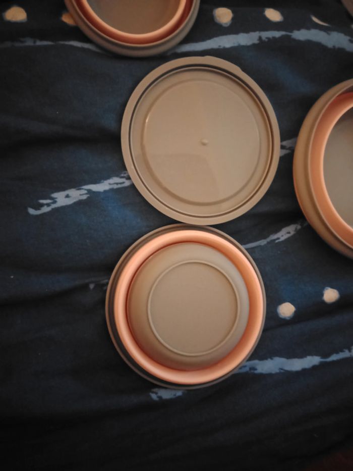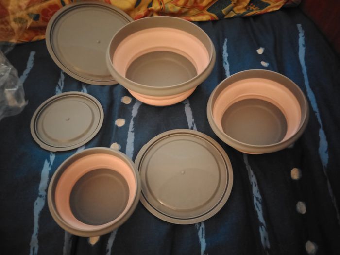 3 boîtes pliables pour frigo ou autre en polypropylène de taille différentes. 300 ml 600 ml et 1000 ml. Rose et gris. Neuves jamais utilisées.
