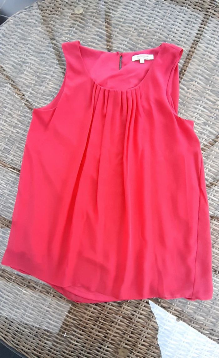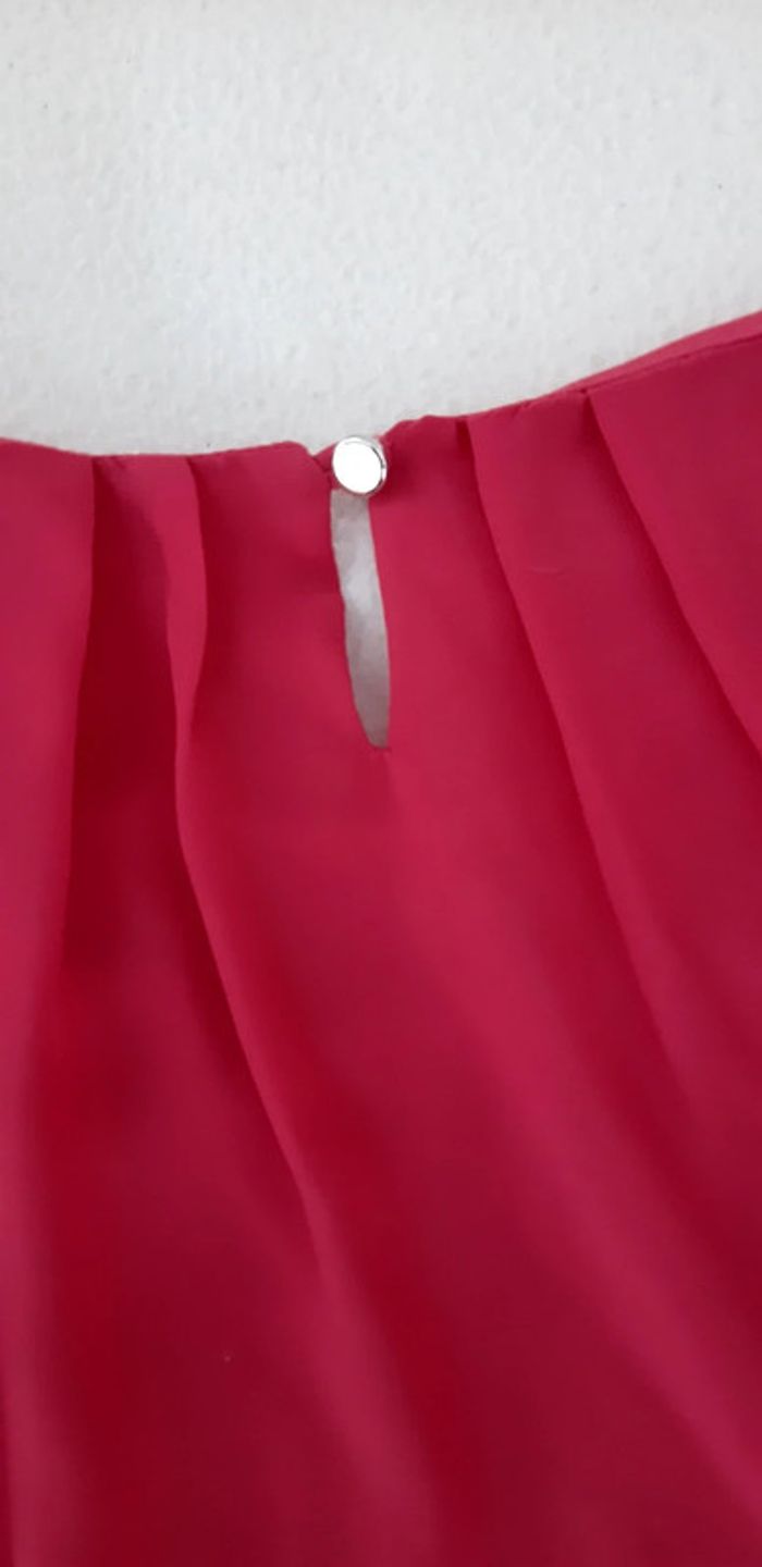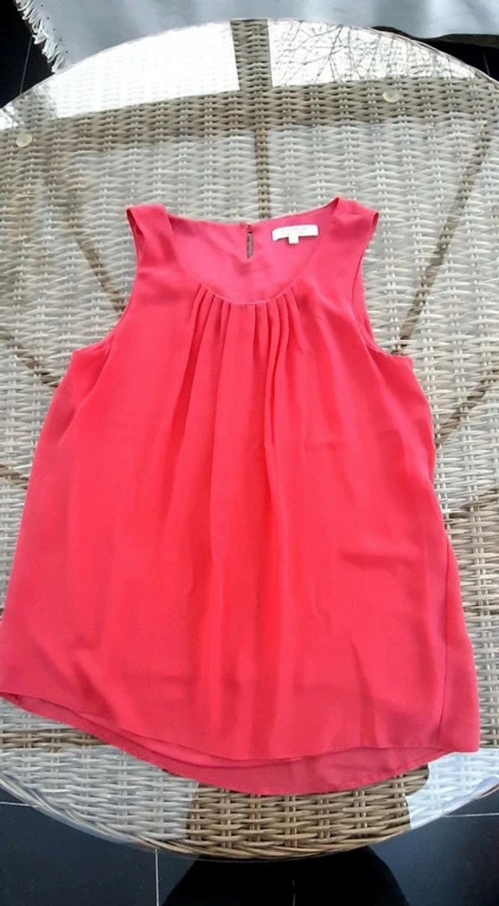 Fluide, coupe un peu plus longue à l l'arrière. Tissus voile doublé polyester. Belle couleur rose et non rouge comme photo. Comme neuf 🙂