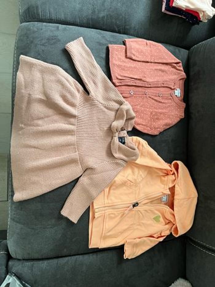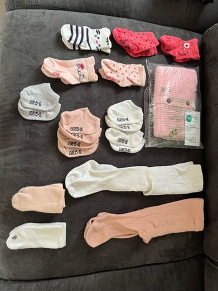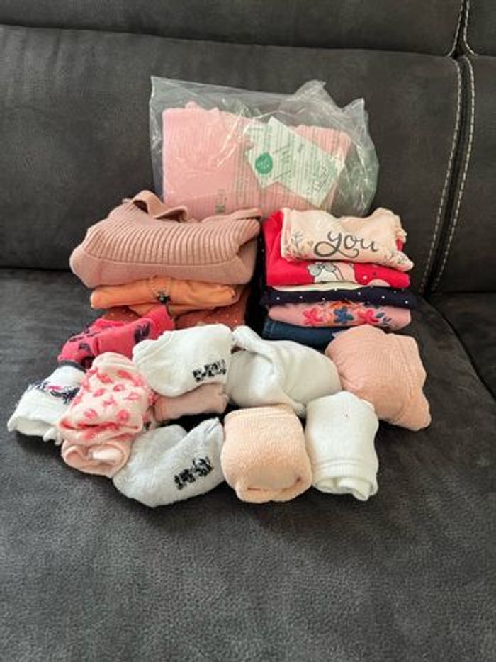 Lot vêtements 3mois fille, composé de 4 t-shirt manche longue, 2 pantalon, 1 robe pull, 3 veste donc une vertbaudet neuve avec étiquette et d’un Lot chaussettes et collant bébé fille. Chaussettes obaibi jamais porté, taille 14. Soquettes taille 15-16 et collant jusqu’à 6mois