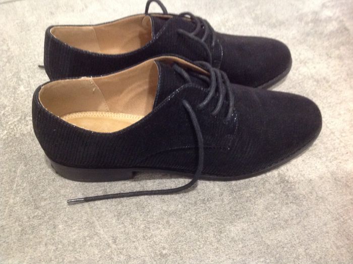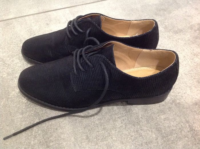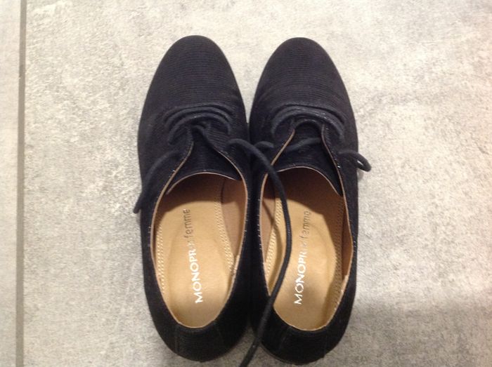 Chaussures pour femme, de type derbies, de marque Monoprix, de pointure 37. Derbies unies noires, en velours effet python. Bout en amande. Fermeture par lacets. Intérieur cuir. Semelle rigide. Hauteur de tige : 6 cm. Hauteur talon : 3 cm. Excellent état, comme neuves, presque jamais portées.