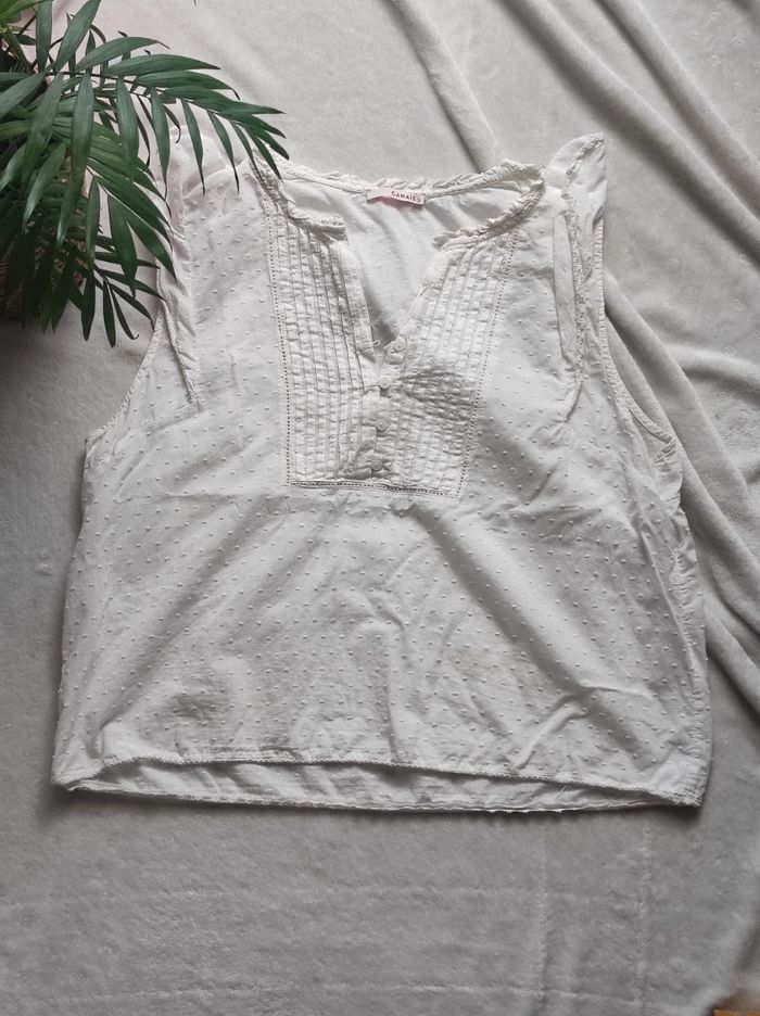 tee shirt / haut sans manches bordures à volant, en blanc petit col à ouverture en v. Marque camaïeu en taille unique. Une tâche jaune sur le bas ( peut-être retirer avec les produits adéquat sûrement ). Hormis cela le reste est en bon état.
