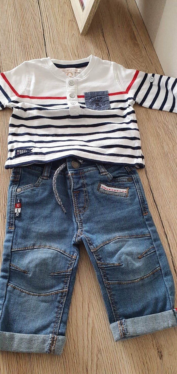 Ensemble comprenant : 1 haut boutons devant manches retroussables 1 jeans Marque lulu castagnette gemo Couleur haut blanc rayures rouge bleu, bas jeans Maison non fumeur