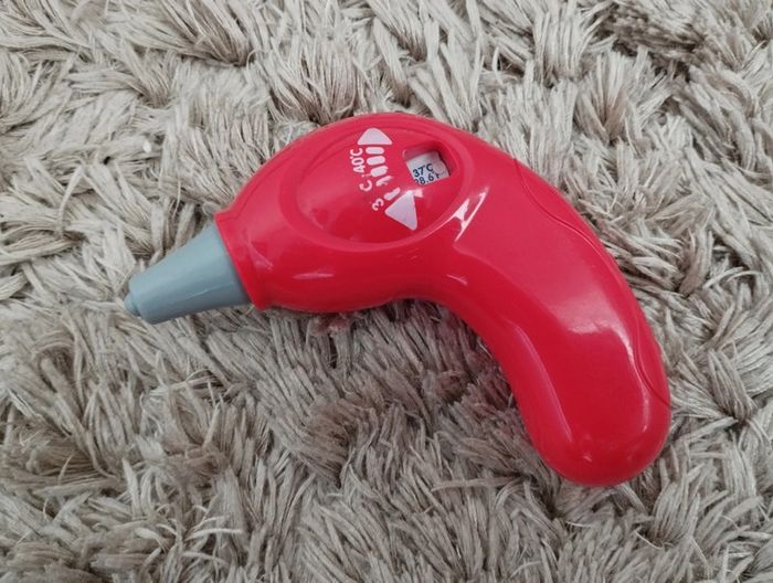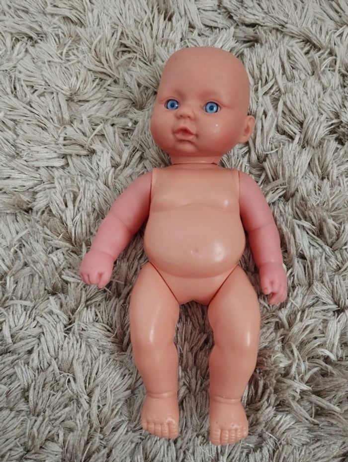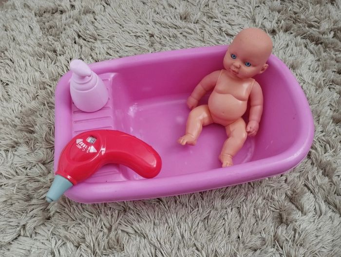 Petit baigneur avec une baignoire, un thermomètre, et du gel douche pour donner le bain à son bébé comme les grands. Le thermomètre permet de prendre la température du bébé à l'aide d'un bouton poussoir. Le tout est en parfait état, il y a juste quelques traces d'usure et d'étiquette enlevée sur le plastique de la baignoire (voir photos). #videchambresjeuxetjouets