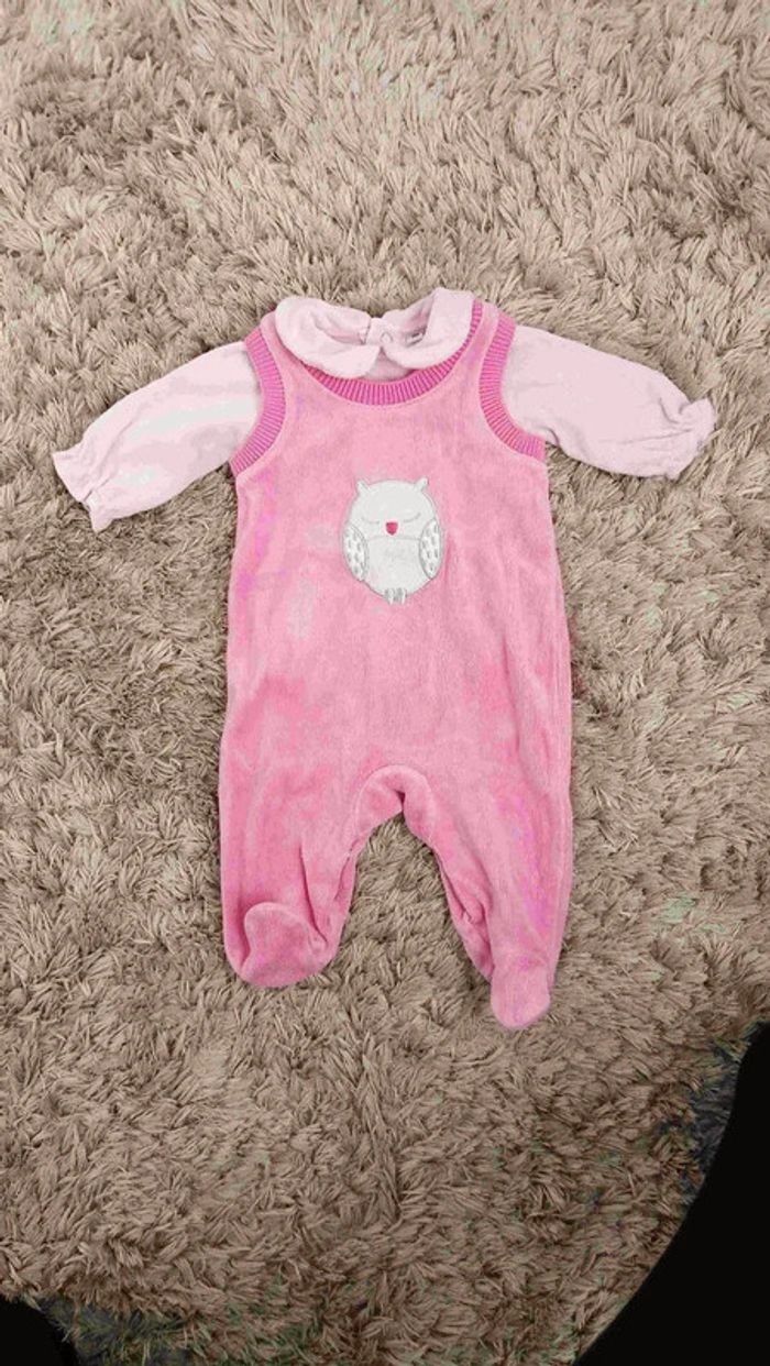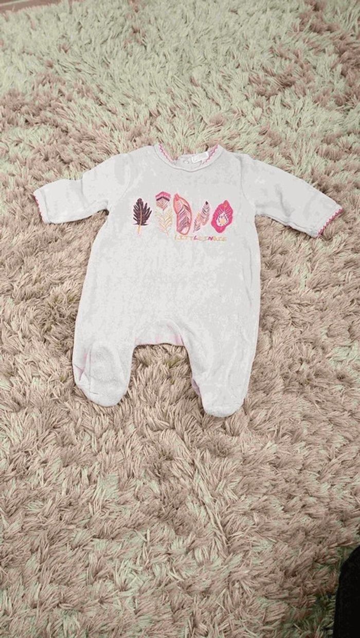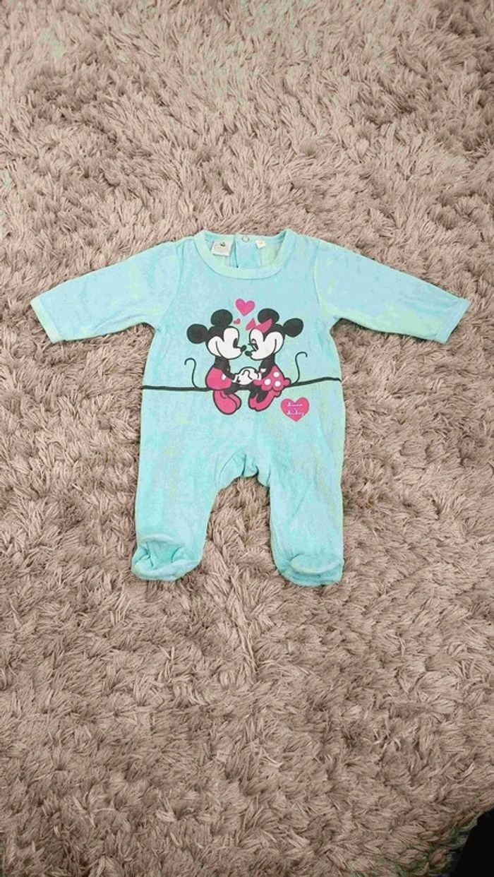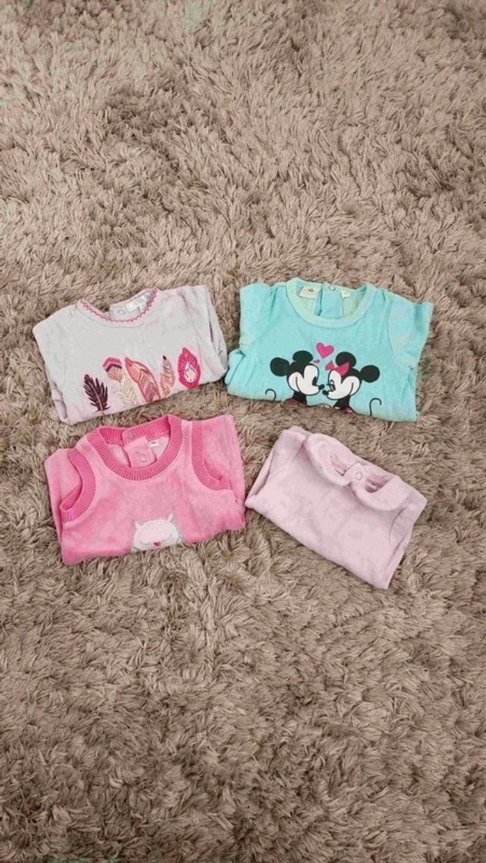 Pyjamas en velours, tous en parfait état car portés seulement une ou deux fois chacun. Un pyjama Mickey et Minnie, un pyjama parme avec des plumes et un ensemble avec un haut col claudine et une combi avec une chouette. Marques : Disney et Kiabi. #videchambres1moisfilles