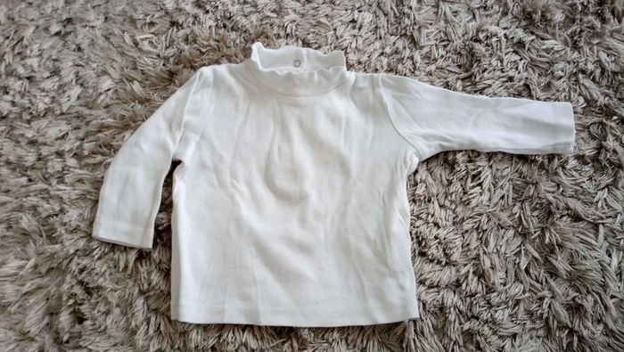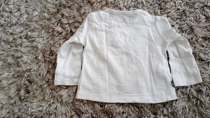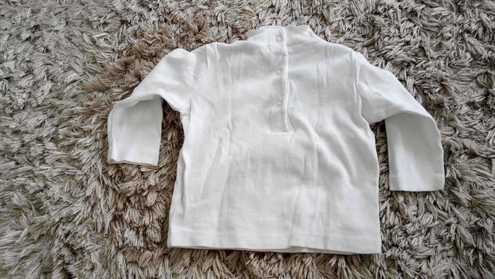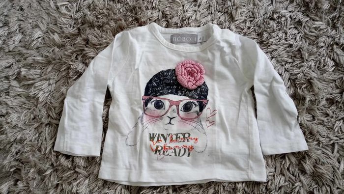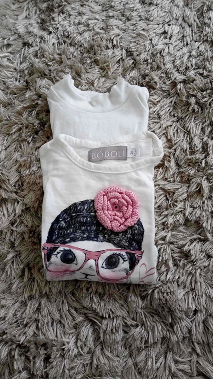2 tee shirt manches longues en parfait état. 1 tee shirt avec un lapin à lunettes avec bonnet tricoté en relief de la marque Boboli et 1 tee shirt blanc uni avec un col montant de la marque grain de blé. Idée de tenue de Pâques par exemple. #videchambres3moisfilles