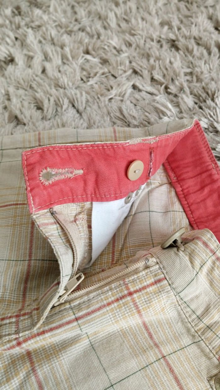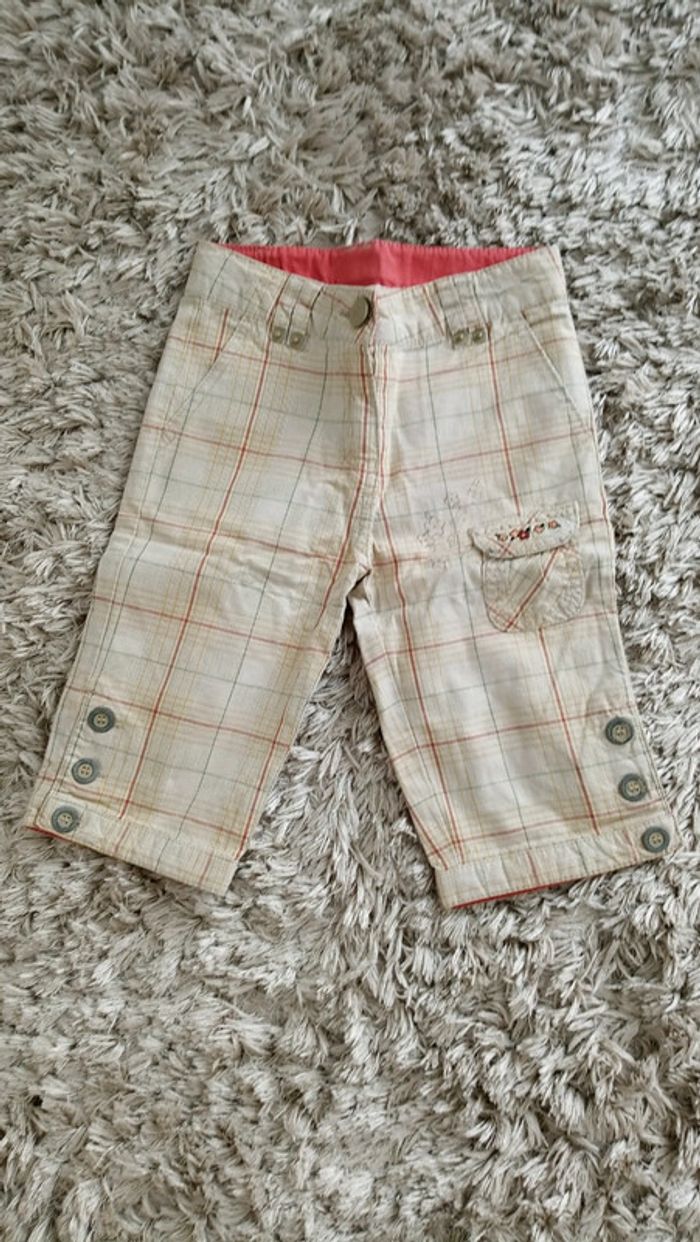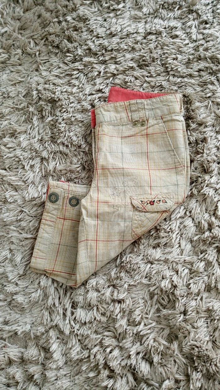 Bermuda long à carreaux avec quelques fleurs autour et sur la poche. Il est en très bon état mais la taille n'est plus ajustable car il manque l'élastique (voir photos). #videchambres3ansfilles #videchambres3ansgarçons