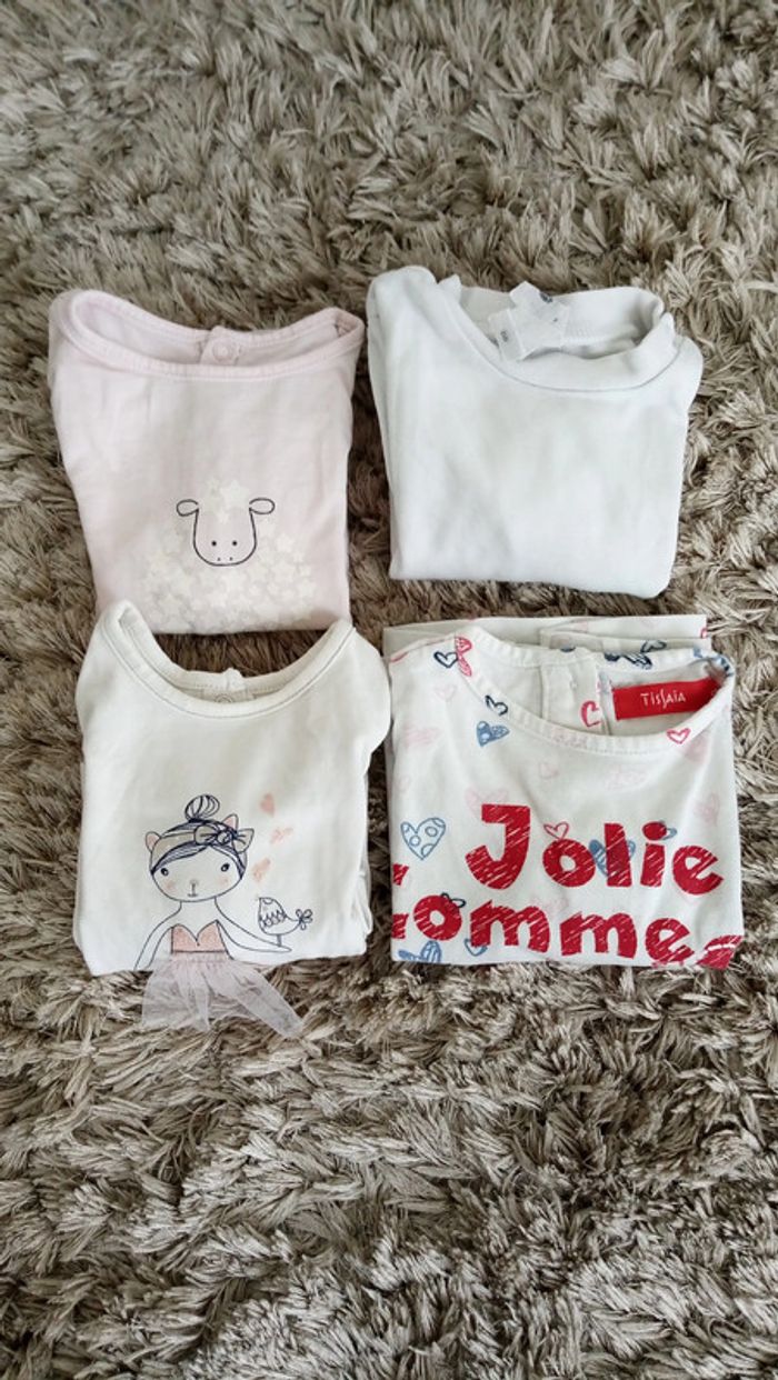 4 tee-shirts manches longues en très bon état. 1 blanc avec une danseuse pailletée rose poudrée de marque Verbaudet, 1 rose pâle avec des étoiles pailletées qui forment un mouton de marque Obaïbi, 1 blanc uni de marque Disney et 1 blanc imprimé coeurs rouges et bleus et avec inscription "jolie comme un coeur" de marque Tissaia. Je peux les vendre à l'unité à 2€. #videchambres6moisfilles