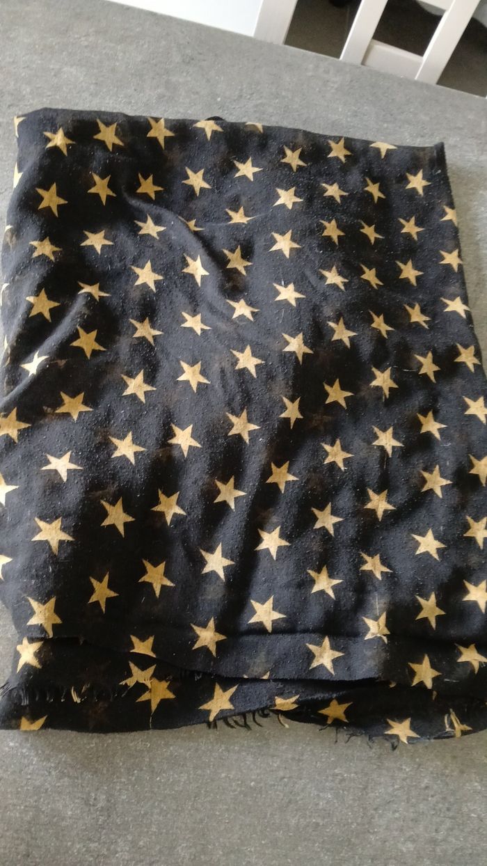 Foulard de couleur noir, grande taille, avec étoiles dorées. Bon état 100% polyesther