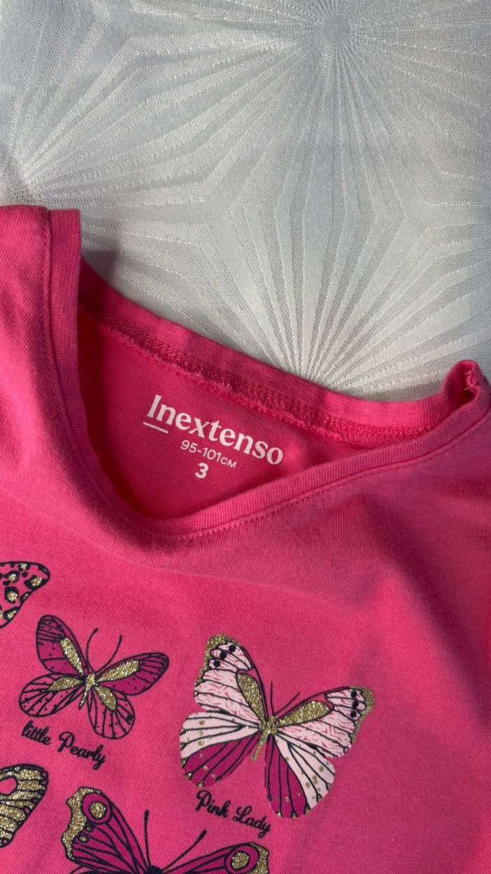 🩷 Tee-shirt à manches longues 🩷 🦋 Taille: 3 ans 🦋 Marque: In extenso 🦋 Couleurs: Rose fuchsia avec des motifs papillons à détails dorés sur l’avant