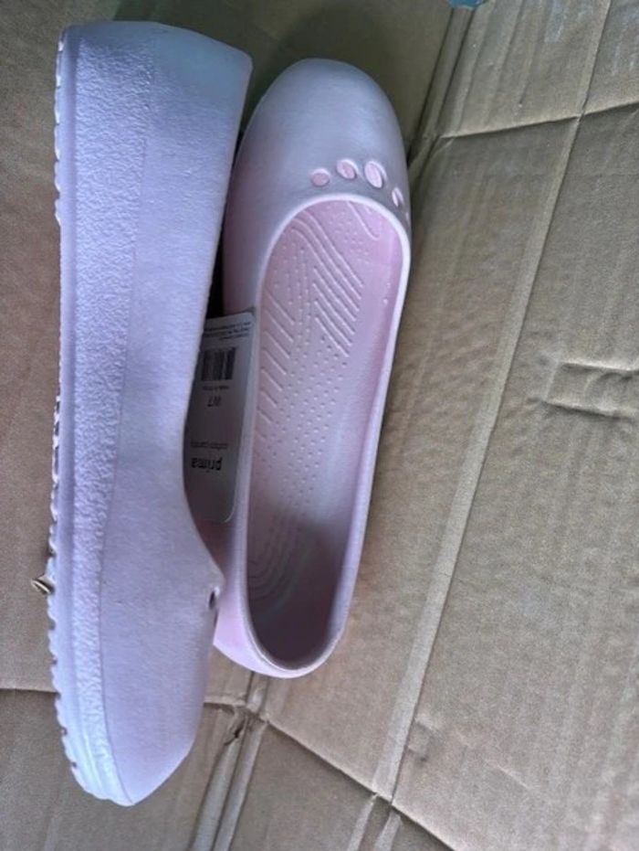 paire de ballerines couleur rose clair marque crocs modele prima taille 37/38 neuves jamais portées ballerines très confortables grace a la fidèle et très connue marque CROCS a porter avec tenue décontractée ou pour apporter un look spécifique idéal pour les ballades en été en bord de place ou dans l'eau elles se rincent en 3 secondes grâce a sa matière plastifiée perlante vos pieds respirent facilement grâce aux trous sur le devant et a l'arrière de la ballerine si vous le souhaitez