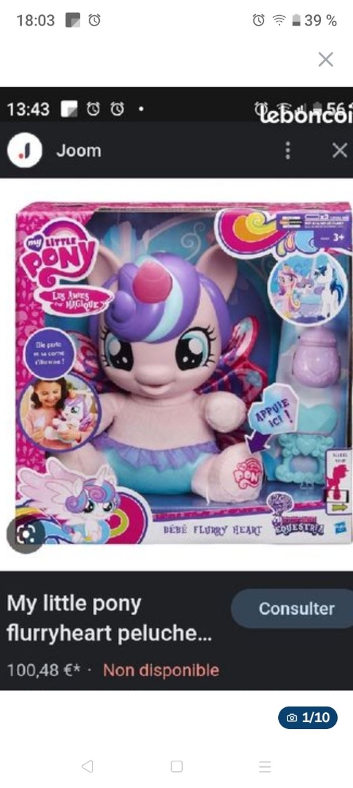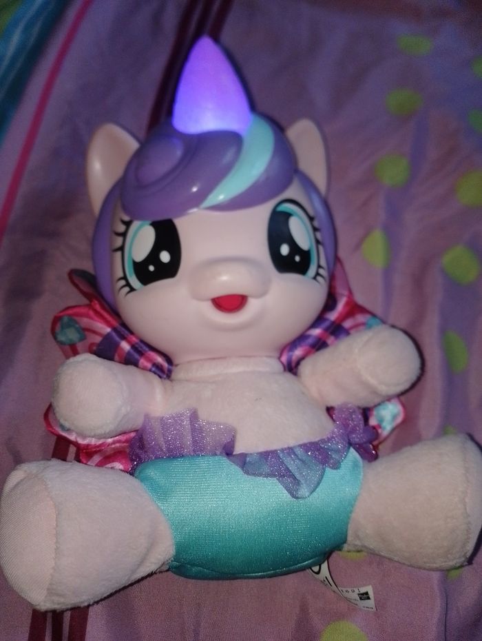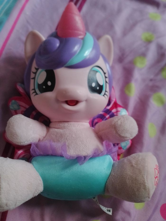 MANQUE les accessoires : la figurine de poney Bébé Flurry Heart, un hochet et un biberon.( N'importe quel biberon peut aussi faire fonctionner la parole au niveau de la bouche)
