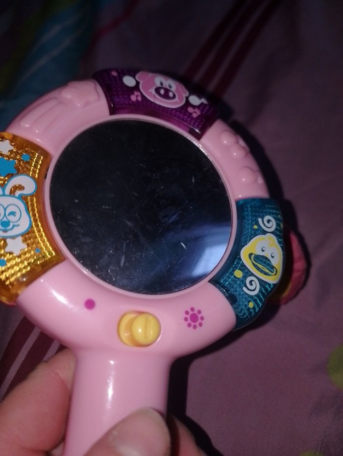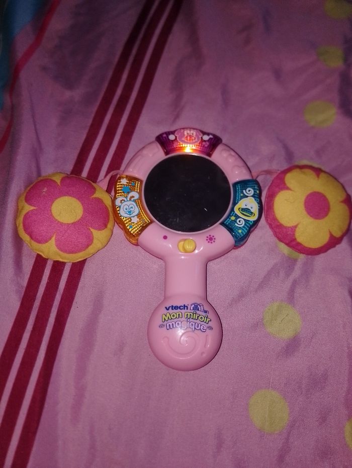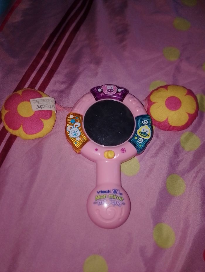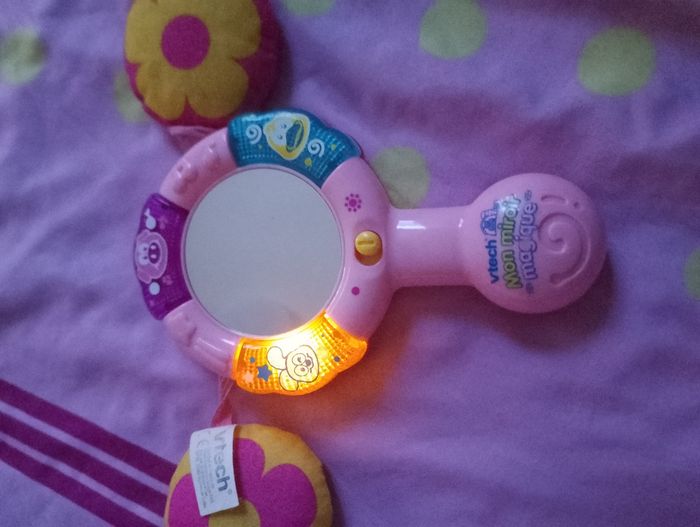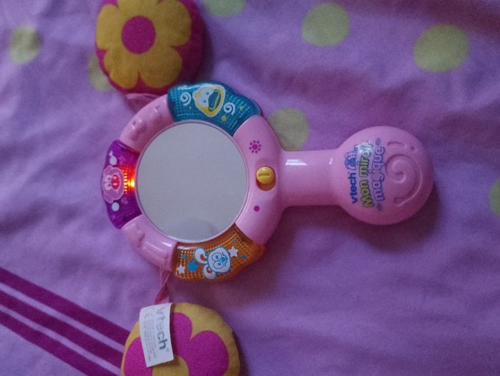 Mon Miroir Magique Rose Vtech - 6 à 24 mois Un miroir parlant et musical qui reconnaît Bébé! Bébé découvre : les animaux, leur cri et leurs particularités 3 boutons lumineux Des questions amusantes adaptées à Bébé pour l'aider à identifier les différentes parties de son visage 6 mélodies et une chanson Un détecteur de mouvement qui déclenche des effets sonores rigolos, des mélodies et une chanson