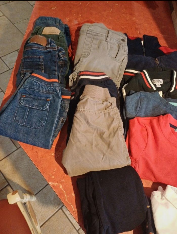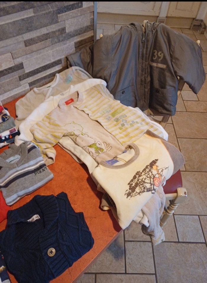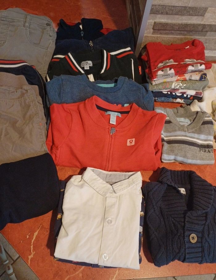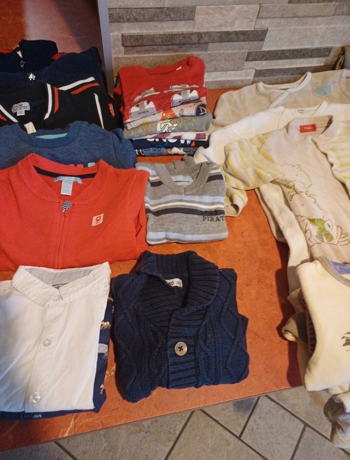 Lot comprenant 1 blouson 3 pyjamas en velours avec pieds 1 pyjama 2 pièces en velours avec pieds 1 gilet 1 pull léger 2 chemises 4 sweats zippé 1 sweat col rond 2 salopettes 6 pantalons 1 bas confortable 6 T.shirts manches longues Différentes marques : timberland, obaibi, vertbaudet, gemo, tissaia..... Possibilité d avoir plus de photos