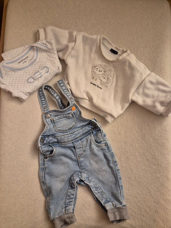 Ensemble salopette + sweat + bodie 1-3 mois. Très peu porté et en très bon état. - Tous les articles sont nettoyés et conservés dans des sacs avant chaque envoi.