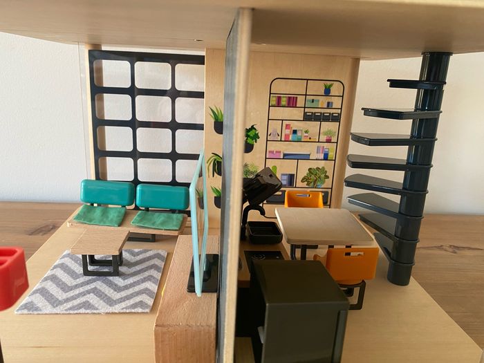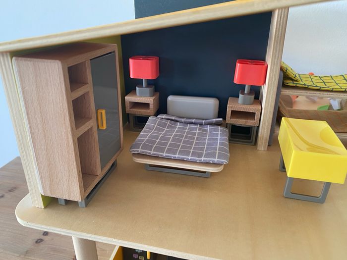 Maison de poupées moderne en bois, entièrement meublée avec ses poupées - photo numéro 5