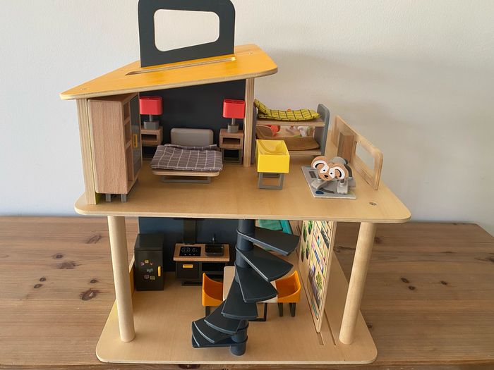 Maison de poupées moderne en bois, entièrement meublée avec ses poupées