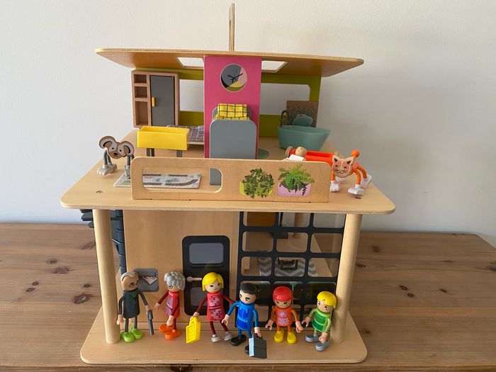 Maison de poupées moderne en bois, entièrement meublée avec ses poupées - photo numéro 1