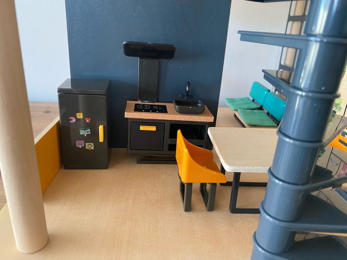 Maison de poupées moderne en bois, entièrement meublée avec ses poupées - photo numéro 7