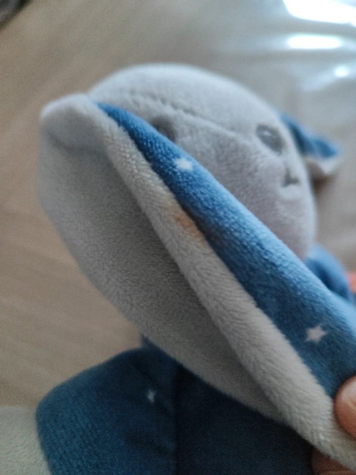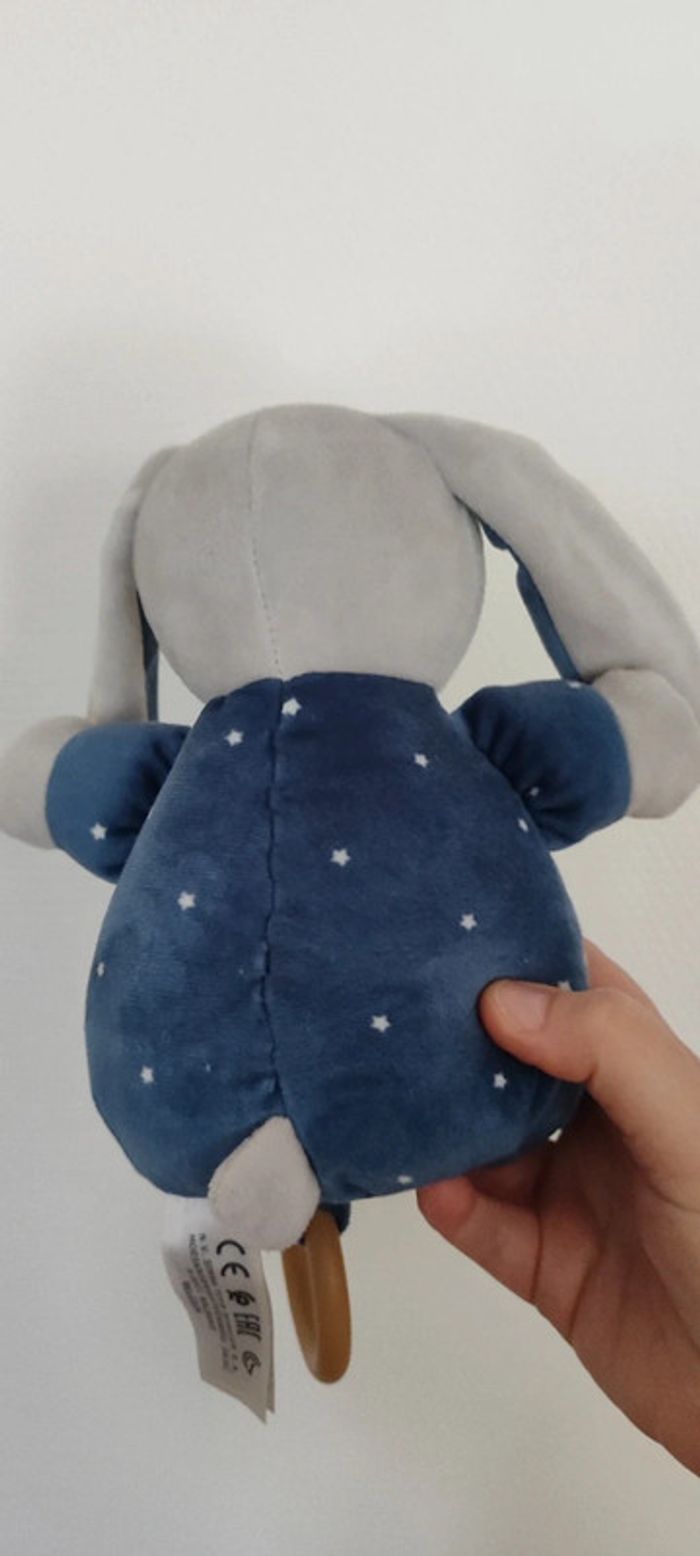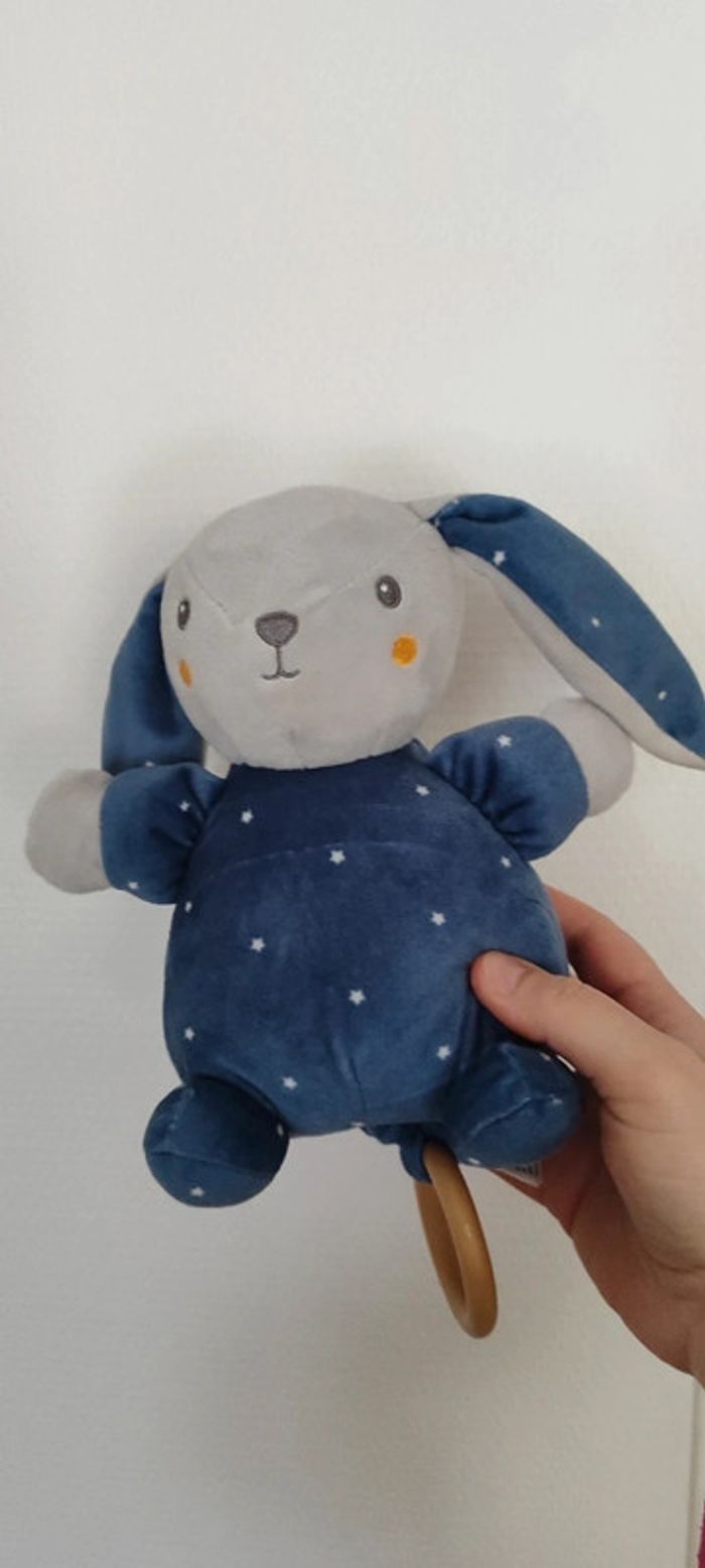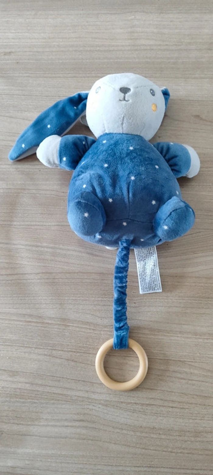 Lapin qui fait de la musique lorsque l'on tire la cordelette. Légère tâche sur une oreille. 20 cm de haut.